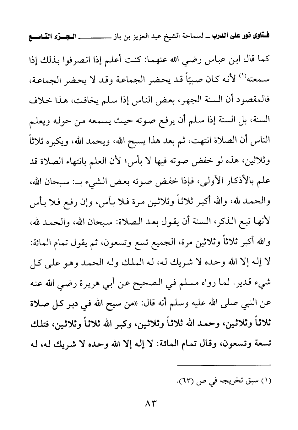 كما قال ابن عباس رضي الله عنهما: «كنت أعلم إذا انصرفوا بذلك إذا سمعته (¬1)»؛ لأنه كان صبيا قد يحضر الجماعة وقد لا يحضر الجماعة، فالمقصود أن السنة الجهر، بعض الناس إذا سلم يخافت، هذا خلاف السنة، بل السنة إذا سلم أن يرفع صوته حيث يسمعه من حوله ويعلم الناس أن الصلاة انتهت، ثم بعد هذا يسبح الله، ويحمد الله، ويكبره ثلاثا وثلاثين، هذه لو خفض صوته فيها لا بأس؛ لأن العلم بانتهاء الصلاة قد علم بالأذكار الأولى، فإذا خفض صوته بعض الشيء بـ: سبحان الله، والحمد لله، والله أكبر ثلاثا وثلاثين مرة فلا بأس، وإن رفع فلا بأس لأنها تبع الذكر، السنة أن يقول بعد الصلاة: سبحان الله، والحمد لله، والله أكبر ثلاثا وثلاثين مرة، الجميع تسع وتسعون، ثم يقول تمام المائة: لا إله إلا الله وحده لا شريك له، له الملك وله الحمد وهو على كل شيء قدير. لما رواه مسلم في الصحيح عن أبي هريرة رضي الله عنه عن النبي صلى الله عليه وسلم أنه قال: «من سبح الله في دبر كل صلاة ثلاثا وثلاثين، وحمد الله ثلاثا وثلاثين، وكبر الله ثلاثا وثلاثين، فتلك تسعة وتسعون، وقال تمام المائة: لا إله إلا الله وحده لا شريك له، له