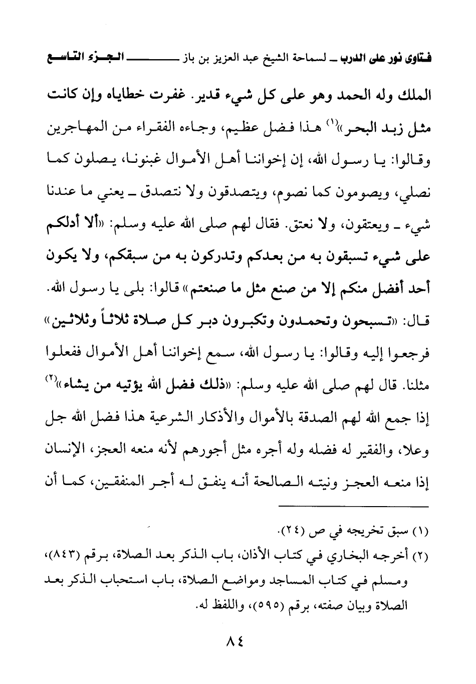 الملك وله الحمد وهو على كل شيء قدير. غفرت خطاياه وإن كانت مثل زبد البحر (¬1)» هذا فضل عظيم، وجاءه الفقراء من المهاجرين وقالوا: يا رسول الله، إن إخواننا أهل الأموال غبنونا، يصلون كما نصلي، ويصومون كما نصوم، ويتصدقون ولا نتصدق – يعني ما عندنا شيء – ويعتقون، ولا نعتق. فقال لهم صلى الله عليه وسلم: «ألا أدلكم على شيء تسبقون به من بعدكم وتدركون به من سبقكم، ولا يكون أحد أفضل منكم إلا من صنع مثل ما صنعتم " قالوا: بلى يا رسول الله. قال: " تسبحون وتحمدون وتكبرون دبر كل صلاة ثلاثا وثلاثين " فرجعوا إليه وقالوا: يا رسول الله، سمع إخواننا أهل الأموال ففعلوا مثلنا. قال لهم صلى الله عليه وسلم: " ذلك فضل الله يؤتيه من يشاء (¬2)» إذا جمع الله لهم الصدقة بالأموال والأذكار الشرعية هذا فضل الله جل وعلا، والفقير له فضله وله أجره مثل أجورهم لأنه منعه العجز، الإنسان إذا منعه العجز ونيته الصالحة أنه ينفق له أجر المنفقين، كما أن
