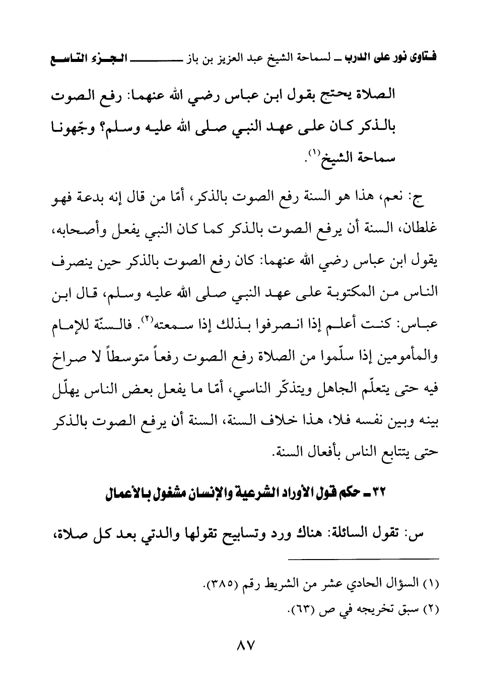 ج: نعم، هذا هو السنة رفع الصوت بالذكر، أما من قال إنه بدعة فهو غلطان، السنة أن يرفع الصوت بالذكر كما كان النبي يفعل وأصحابه، يقول ابن عباس رضي الله عنهما: كان رفع الصوت بالذكر حين ينصرف الناس من المكتوبة على عهد النبي صلى الله عليه وسلم، قال ابن عباس: «كنت أعلم إذا انصرفوا بذلك إذا سمعته (¬2)» فالسنة للإمام والمأمومين إذا سلموا من الصلاة رفع الصوت رفعا متوسطا لا صراخ فيه حتى يتعلم الجاهل ويتذكر الناسي، أما ما يفعل بعض الناس يهلل بينه وبين نفسه فلا، هذا خلاف السنة، السنة أن يرفع الصوت بالذكر حتى يتتابع الناس بأفعال السنة.