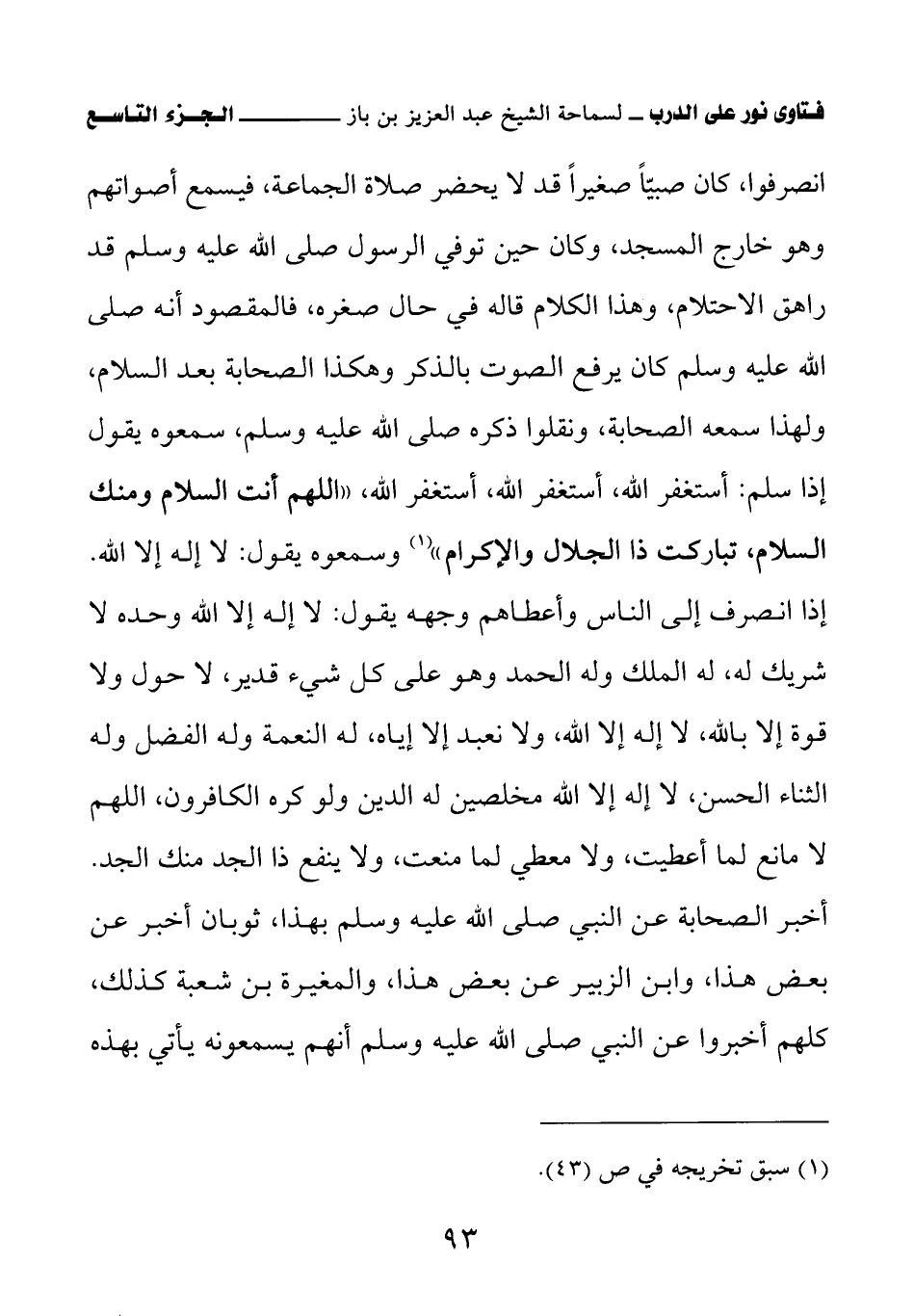 انصرفوا، كان صبيا صغيرا قد لا يحضر صلاة الجماعة، فيسمع أصواتهم وهو خارج المسجد، وكان حين توفي الرسول صلى الله عليه وسلم قد راهق الاحتلام، وهذا الكلام قاله في حال صغره، فالمقصود أنه صلى الله عليه وسلم كان يرفع الصوت بالذكر وهكذا الصحابة بعد السلام، ولهذا سمعه الصحابة، ونقلوا ذكره صلى الله عليه وسلم، سمعوه يقول إذا سلم: أستغفر الله، أستغفر الله، أستغفر الله، «اللهم أنت السلام ومنك السلام، تباركت ذا الجلال والإكرام (¬1)» وسمعوه يقول: لا إله إلا الله. إذا انصرف إلى الناس وأعطاهم وجهه يقول: لا إله إلا الله وحده لا شريك له، له الملك وله الحمد وهو على كل شيء قدير، لا حول ولا قوة إلا بالله، لا إله إلا الله، ولا نعبد إلا إياه، له النعمة وله الفضل وله الثناء الحسن، لا إله إلا الله مخلصين له الدين ولو كره الكافرون، اللهم لا مانع لما أعطيت، ولا معطي لما منعت، ولا ينفع ذا الجد منك الجد. أخبر الصحابة عن النبي صلى الله عليه وسلم بهذا، ثوبان أخبر عن بعض هذا، وابن الزبير عن بعض هذا، والمغيرة بن شعبة كذلك، كلهم أخبروا عن النبي صلى الله عليه وسلم أنهم يسمعونه يأتي بهذه