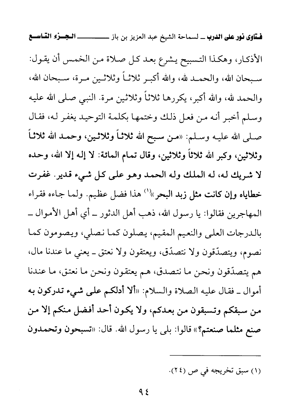 الأذكار، وهكذا التسبيح يشرع بعد كل صلاة من الخمس أن يقول: سبحان الله، والحمد لله، والله أكبر ثلاثا وثلاثين مرة، سبحان الله، والحمد لله، والله أكبر، يكررها ثلاثا وثلاثين مرة. النبي صلى الله عليه وسلم أخبر أنه من فعل ذلك وختمها بكلمة التوحيد يغفر له، فقال صلى الله عليه وسلم: «من سبح ثلاثا وثلاثين، وحمد الله ثلاثا وثلاثين، وكبر الله ثلاثا وثلاثين، وقال تمام المائة: لا إله إلا الله، وحده لا شريك له، له الملك وله الحمد وهو على كل شيء قدير. غفرت خطاياه وإن كانت مثل زبد البحر (¬1)» هذا فضل عظيم. ولما جاءه فقراء المهاجرين فقالوا: يا رسول الله، ذهب أهل الدثور – أي أهل الأموال – بالدرجات العلى والنعيم المقيم، يصلون كما نصلي، ويصومون كما نصوم، ويتصدقون ولا نتصدق، ويعتقون ولا نعتق – يعني ما عندنا مال هم يتصدقون ونحن ما نتصدق، هم يعتقون ونحن ما نعتق، ما عندنا أموال – فقال عليه الصلاة والسلام: " ألا أدلكم على شيء تدركون به من سبقكم وتسبقون من بعدكم، ولا يكون أحد أفضل منكم إلا من صنع مثلما صنعتم؟ " قالوا: بلى يا رسول الله، قال: «تسبحون وتحمدون