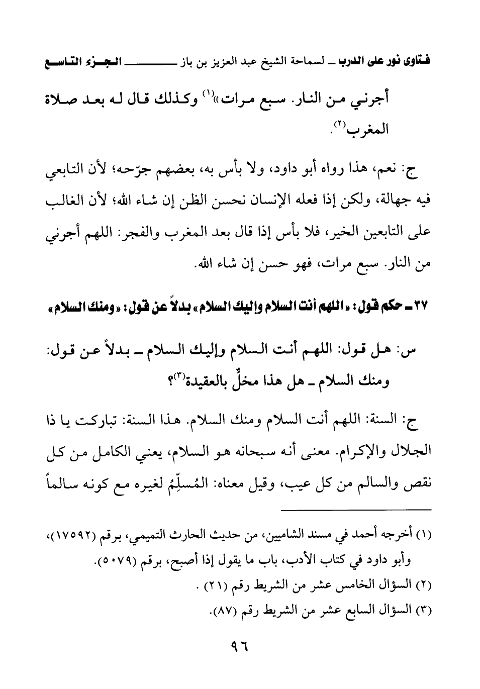 ج: نعم، هذا رواه أبو داود، ولا بأس به، بعضهم جرحه؛ لأن التابعي فيه جهالة، ولكن إذا فعله الإنسان نحسن الظن إن شاء الله؛ لأن الغالب على التابعين الخير، فلا بأس إذا قال بعد المغرب والفجر: اللهم أجرني من النار. سبع مرات، فهو حسن إن شاء الله.