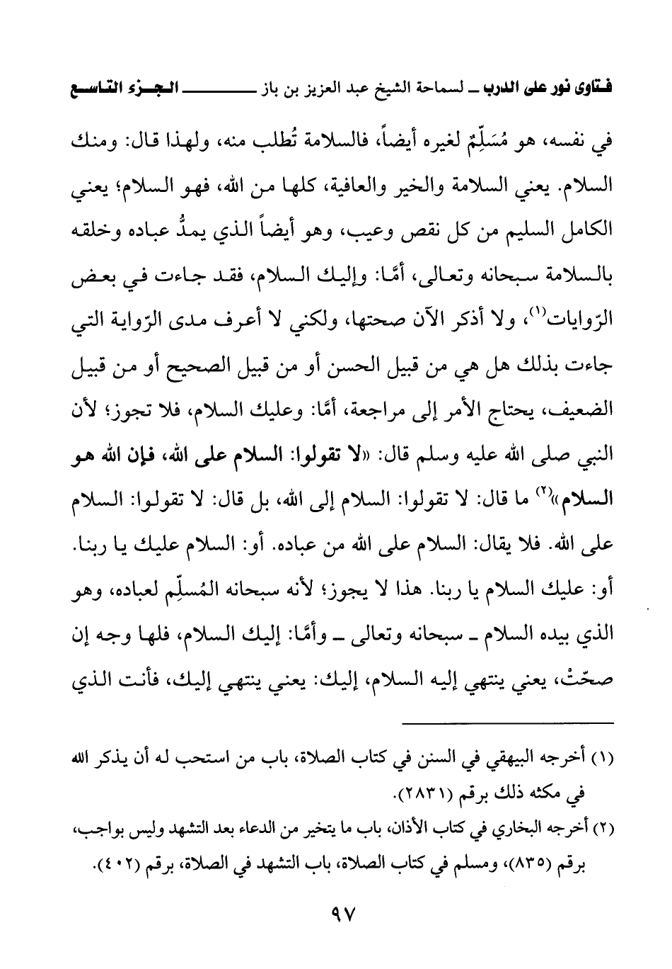 في نفسه، هو مسلم لغيره أيضا، فالسلامة تطلب منه، ولهذا قال: (ومنك السلام) يعني السلامة والخير والعافية، كلها من الله، فهو السلام، يعني الكامل السليم من كل نقص وعيب، وهو أيضا الذي يمد عباده وخلقه بالسلامة سبحانه وتعالى، أما: وإليك السلام، فقد جاءت في بعض الروايات (¬1) ولا أذكر الآن صحتها، ولكني لا أعرف مدى الرواية التي جاءت بذلك هل هي من قبيل الحسن أو من قبيل الصحيح أو من قبيل الضعف، يحتاج الأمر إلى مراجعة، أما: وعليك السلام، فلا تجوز؛ لأن النبي صلى الله عليه وسلم قال: «لا تقولوا السلام على الله، فإن الله هو السلام (¬2)» ما قال: لا تقولوا: السلام إلى الله، بل قال: لا تقولوا: السلام على الله. فلا يقال: السلام على الله من عباده. أو: السلام عليك يا ربنا. أو: عليك السلام يا ربنا. هذا لا يجوز؛ لأنه سبحانه المسلم لعباده، وهو الذي بيده السلام – سبحانه وتعالى – وأما: إليك السلام، فلها وجه إن صحت، يعني ينتهي إليه السلام، إليك: يعني ينتهي إليك، فأنت الذي