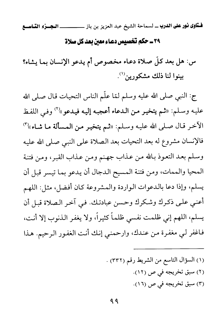 س: هل بعد كل صلاة دعاء مخصوص أم يدعو الإنسان بما يشاء؟ بينوا لنا ذلك مشكورين. (¬1)