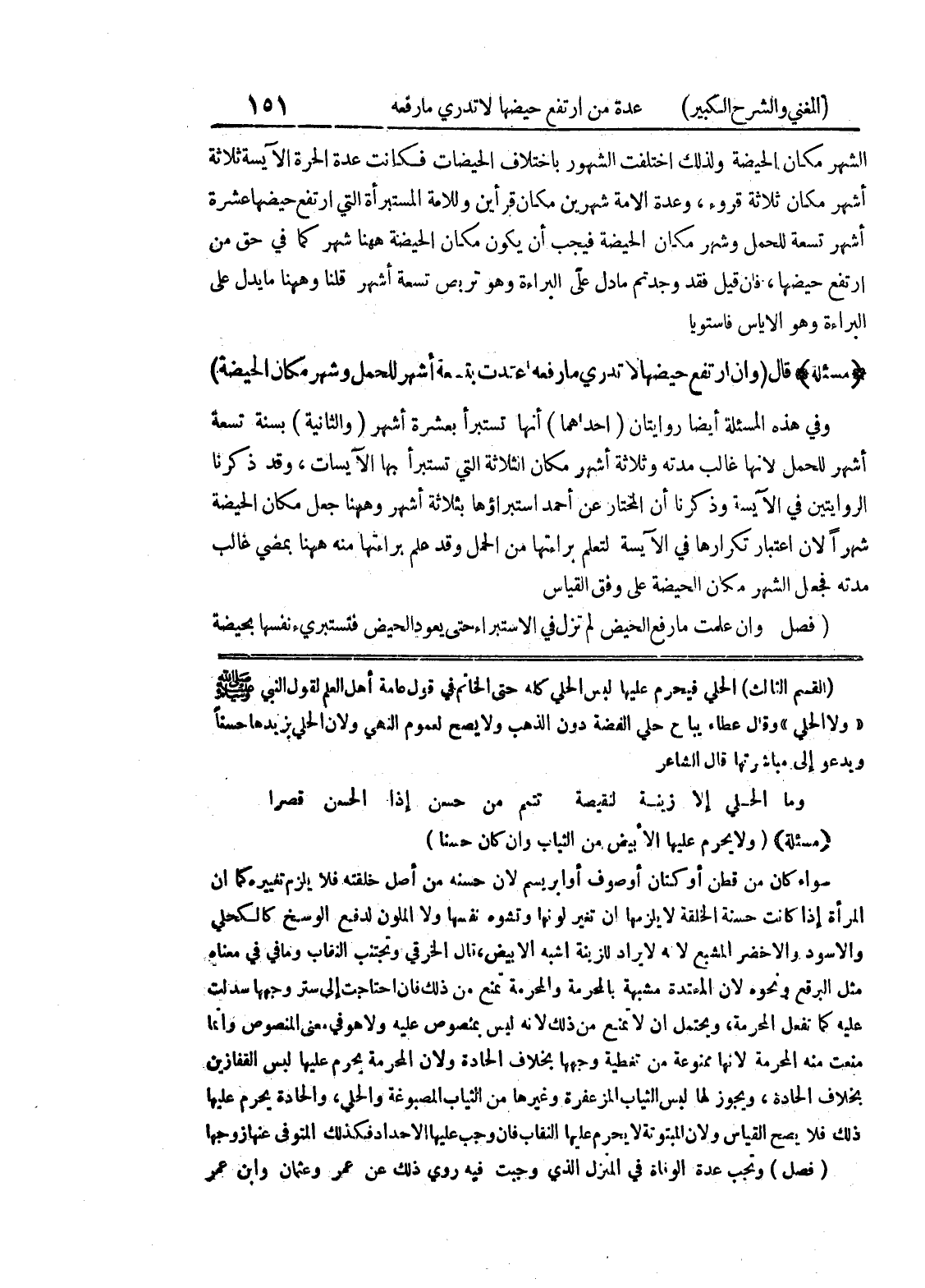 ويدعو إلى مباشرتها قال الشاعر وما الحلي إلا زينة لنقيصة * * تتم من حسن إذا الحسن قصرا (مسألة) (ولا يحرم عليها الأبيض من الثياب وإن كان حسناً) سواء كان من قطن أو كتان أو صوف أو إبريسم لأن حسنه من أصل خلقته فلا يلزم تغييره كما أن المرأة إذا كانت حسنة الخلقة لا يلزمها أن تغير لونها وتشوه نفسها ولا الملون لدفع الوسخ كالكحلي والأسود والأخضر المشبع لأنه لا يراد للزينة أشبه الأبيض، قال الخرقي وتجتنب النقاب وما في في معناه مثل البرقع ونحوه لأن المعتدة مشبهة بالمحرمة والمحرمة تمنع من ذلك فإن احتاجت الى ستر وجهها سدلت عليه كما تفعل المحرمة، ويحتمل أن لا تمنع من ذلك لأنه ليس بمنصوص عليه ولا هو في معنى المنصوص وإنما منعت منه المحرمة لأنها ممنوعة من تغطية وجهها بخلاف الحادة ولأن المحرمة يحرم عليها لبس القفازين بخلاف الحادة، ويجوز لها لبس الثياب المزعفرة وغيرها من الثياب المصبوغة والحلي، والحادة يحرم عليها ذلك فلا يصح القياس ولأن المبتوتة لا يحرم عليها النقاب فإن وجب عليها الإحداد فكذلك المتوفى عنها زوجها (فصل) وتجب عدة الوفاة في المنزل الذي وجبت فيه روى ذلك عن عمر وعثمان وابن عمر