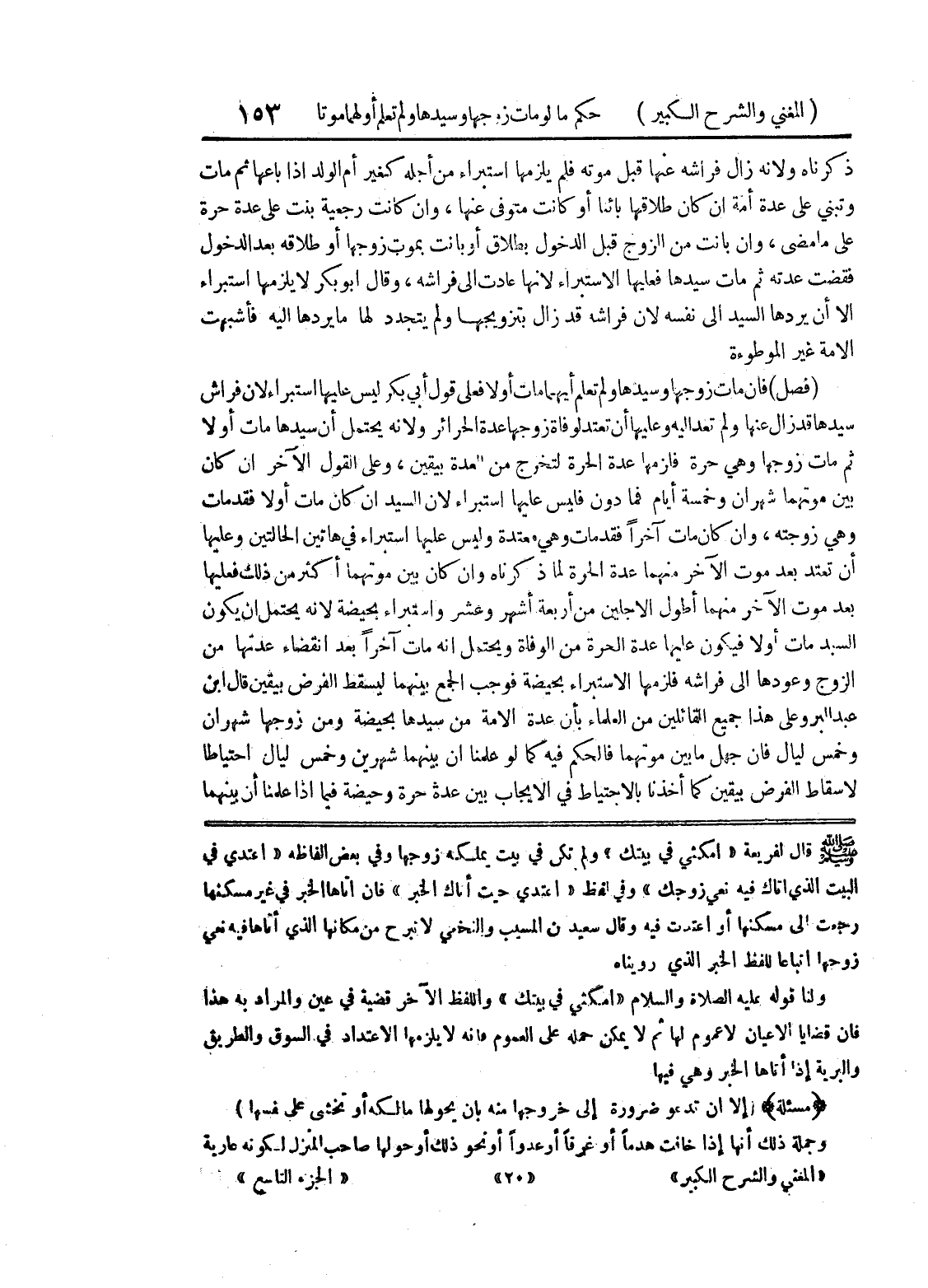 صلى الله عليه وسلم قال لفريعة " امكثي في بيتك " ولم تكن في بيت يملكه زوجها وفي بعض ألفاظه " اعتدي في البيت الذي أتاك فيه نعي زوجك " وفي لفظ " اعتدي حيث أتاك الخبر " فإن أتاها الخبر في غير مسكنها رجعت الى مسكنها أو اعتدت فيه وقال سعيد بن المسيب والنخعي لا تبرح من مكانها الذي أتاها فيه نعي زوجها اتباعا للفظ الخبر الذي رويناه ولنا قوله عليه الصلاة والسلام " امكثي في بيتك " واللفظ الآخر قضية في عين والمراد به هذا فإن قضايا الأعيان لا عموم لها ثم لا يمكن حمله على العموم فإنه لا يلزمها الاعتداد في السوق والطريق والبرية إذا أتاها الخبر وهي فيها (مسألة) (إلا أن تدعو ضرورة الى خروجها منه بأن يحولها مالكه أو تخشى على نفسها) وجملة ذلك أنها إذا خافت هدماً أو غرما أو عدواً أو نحو ذلك أو حولها صاحب المنزل لكونه عارية