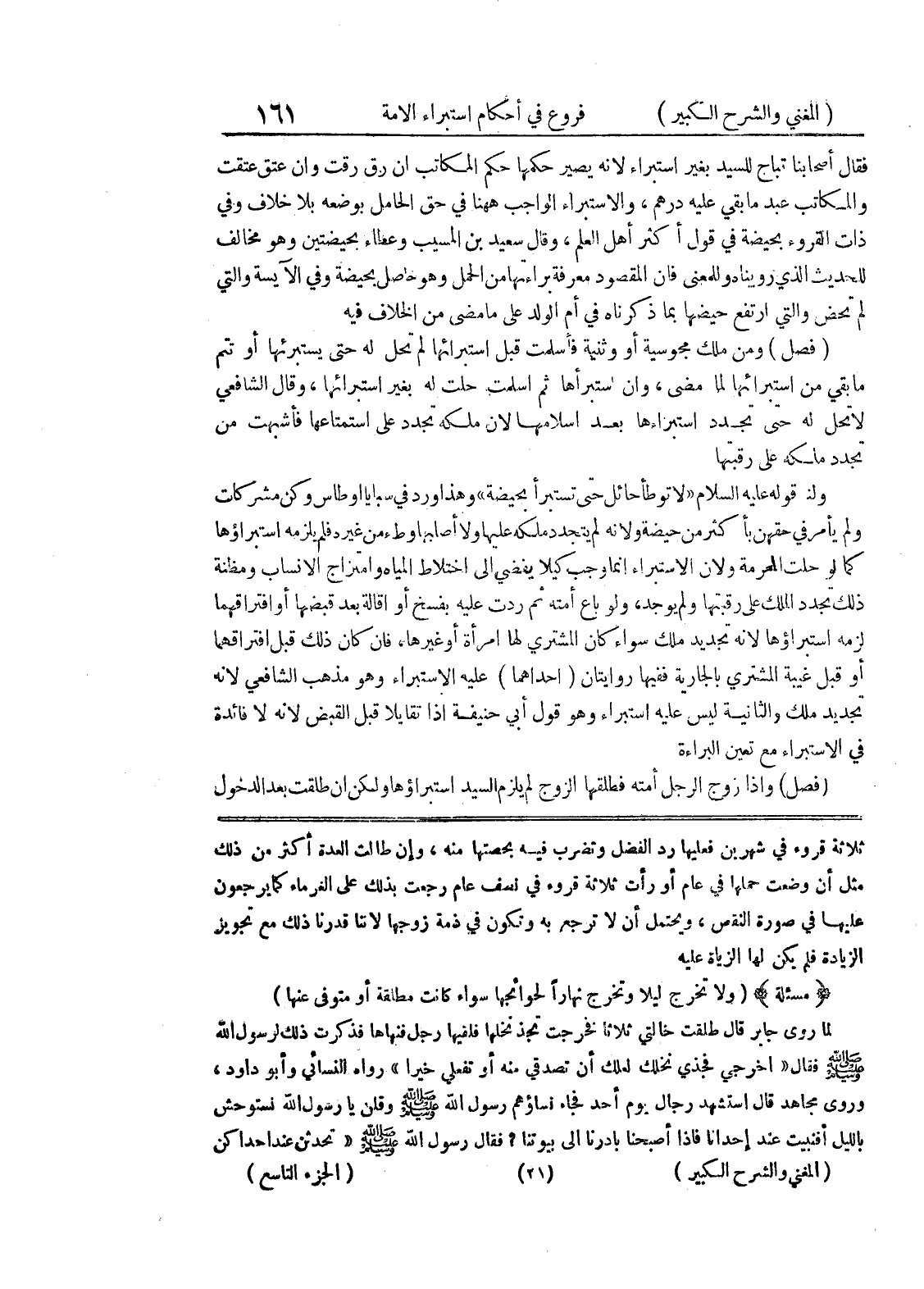 ثلاثة قروء في شهرين فعليها رد الفضل وتضرب فيه بحصتها منه، وإن طالت العدة أكثر من ذلك مثل أن وضعت حملها في عام أو رأت ثلاثة قروء في نصف عام رجعت بذلك على الغرماء كما يرجعون عليها في صورة النقص، ويحتمل أن لا ترجع به وتكون في ذمة زوجها لأننا قدرنا ذلك مع تجويز الزيادة فلم يكن لها الزياة عليه (مسألة) (ولا تخرج ليلاً وتخرج نهاراً لحوائجها سواء كانت مطلقة أو متوفى عنها) لما روى جابر قال طلقت خالتي ثلاثاً فخرجت تجذ نخلها فلقيها رجل فنهاها فذكرت ذلك لرسول الله صلى الله عليه وسلم فقال " اخرجي فجذي نخلك لعلك أن تصديق منه أو تفعلي خيرا " رواه النسائي وأبو داود، وروى مجاهد قال استشهد رجال يوم أحد فجاء نساؤهم رسول الله صلى الله عليه وسلم وقلن يا رسول نستوحش بالليل أفنبيت عند إحدانا فإذا أصبحنا بادرنا إلى بيوتنا؟ فقال رسول الله صلى الله عليه وسلم " تحدثن عند إحداكن
