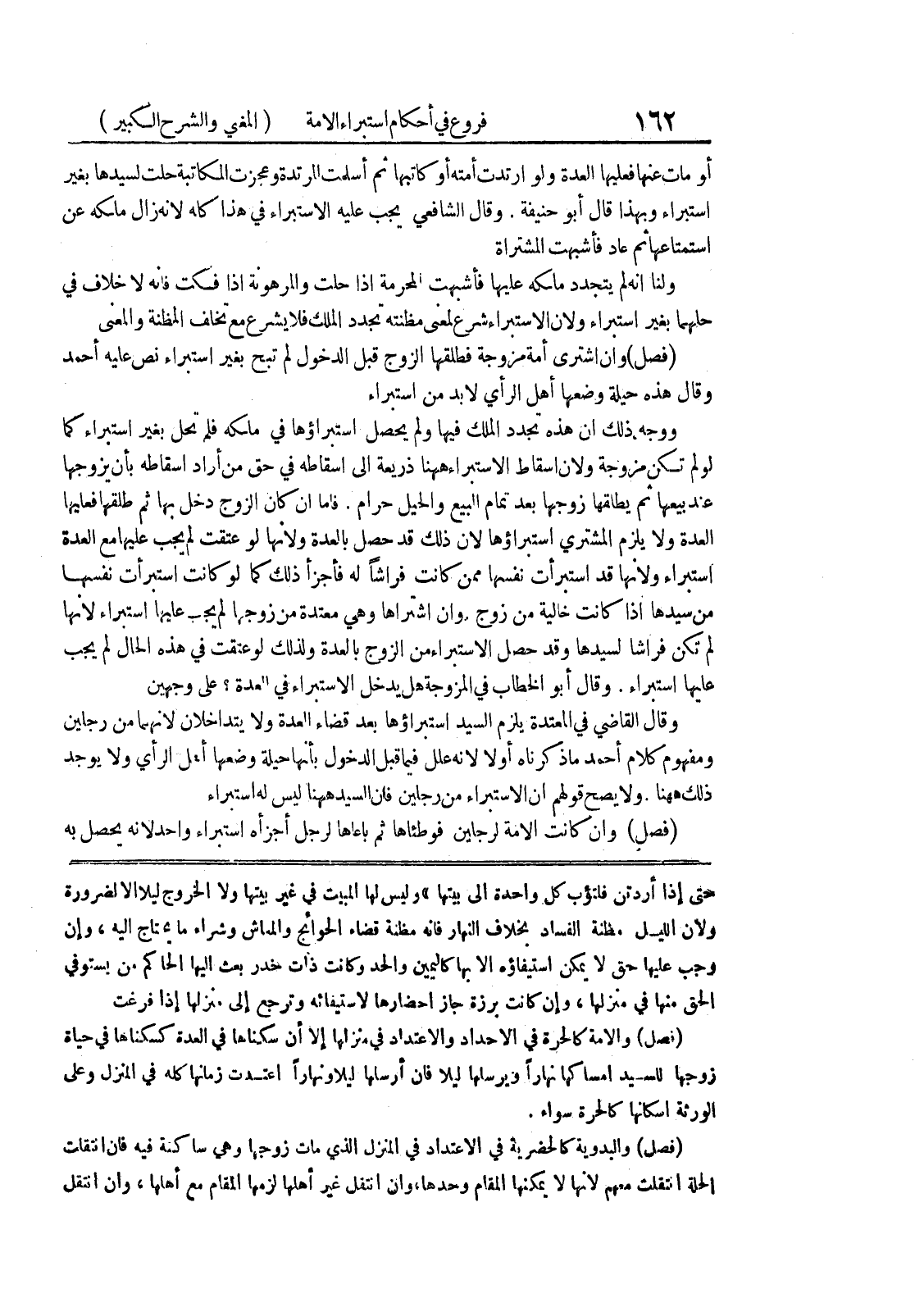 حتى إذا أردتن فلتؤب كل واحدة إلى بيتها " وليس لها المبيت في غير بيتها ولا الخروج ليلاً إلا لضرورة ولأن الليل مظنة الفساد بخلاف النهار فإنه مظنة قضاء الحوائج والمعاش وشراء ما يحتاج إليه، وإن وجب عليها حق لا يمكن اسيتفاؤه إلا بها كاليمين والحد وكانت ذات خدر بعث اليها الحاكم من يستوفي الحق منها في منزلها، وإن كانت برزة جاز احضارها لا ستيفائه وترجع إلى منزلها إذا فرغت (فصل) والأمة كالحرة في الإحداد والاعتداد في منزلها إلا أن سكناها في العدة كسكناها في حياة زوجها للسيد إمساكها نهار أو يرسلها ليلاً فإن ارسلها ليلاً ونهاراً اعتدت زمانها كله في المنزل وعلى الورثة إسكانها كالحرة سواء.