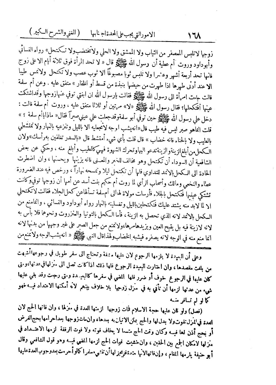 وعلى أن البعيدة لا يلزمها الرجوع لأن عليها مشقة وتحتاج إلى سفر طويل في رجوعها أشبهت من بلغت مقصدها، وإن اختارت البعيدة الرجوع فلها ذلك إذا كانت تصل إلى منزلها في عدتها، ومتى كان عليها في الرجوع خوف أو ضرر فلها المضي في سفرها كالبعيدة ومتى رجعت وقد بقي عليها شئ من عدتها لزمها أن تأتي به في منزل زوجها بلا خلاف بينهم لأنه أمكنها الاعتداد فيه فهو كما لو لم تسافر منه (فصل) ولو كان عليها حجة الإسلام فمات زوجها لزمتها العدة في منزلها، وإن فاتها الحج لأن العدة في المنزل تفوت ولا بدل لها والحج يمكن الاتيان به بعدها، وإن مات زوجها بعد إحرامها بحج الفرض أو بحج أذن لها فيه وكان وقت الحج متسعاً لا يخاف فوته ولا فوت الرفقة لزمها الاعتداد في