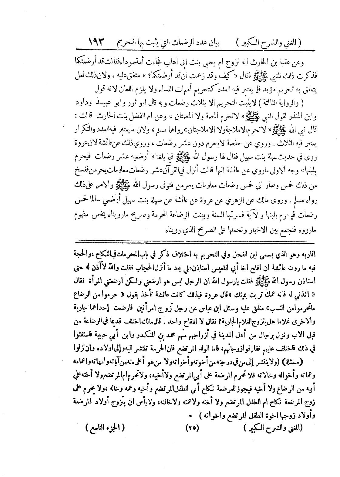 أقاربه وهو الذي يسمى لبن الفحل وفي التحريم به اختلاف ذكر في باب المحرمات في النكاح، والحجة فيه ما روت عائشة أن أفلح أخا أبي القعيس استأذن علي بعد ما أنزل الحجاب فقلت والله لا آذن له حتى استأذن رسول الله صلى الله عليه وسلم فقلت يا رسول الله إن الرجل ليس هو أرضعني ولكن أرضعتني المرأة فقال " ائذني له فإنه عمك تربت يمينك " قال عروة فبذلك كانت عائشة تأخذ بقول " حرموا من الرضاع ما تحرموا من النسب " متفق عليه وسئل ابن عباس عن رجل تزوج امرأتين فأرضعت إحداهما جارية والأخرى غلاماً هل يتزوج الغلام الجارية؟ فقال لا اللقاح واحد.