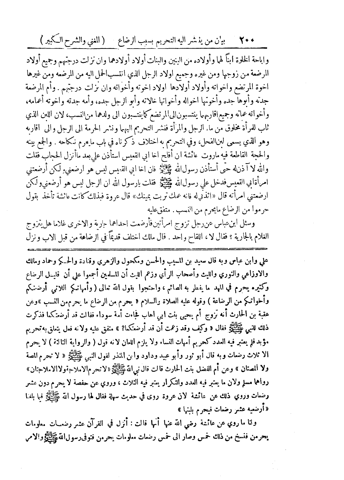 وأخواتكم من الرضاعة) وقوله عليه الصلاة والسلام " يحرم من الرضاع ما يحرم من النسب " وعن عقبة بن الحارث أنه تزوج أم يحيى بنت أبي أهاب فجاءت سوداء فقالت قد أرضعتكما فذكرت ذلك للنبي صلى الله عليه وسلم فقال " وكيف وقد زعمت أن قد أرضعتكما؟ " متفق عليه ولأنه فعل يتعلق به تحريم مؤبد فلم يعتبر فيه العدد كحريم أمهات النساء ولا يلزم اللعان لأنه قول (والرواية الثالثة) لا يحرم إلا ثلاث رضعات وبه قال أبو ثور وأبو عبيد وداود وابن المنذر لقول النبي صلى الله عليه وسلم " لا تحرم المصة ولا المصتان " وعن أم الفضل بنت الحارث قالت قال نبي الله صلى الله عليه وسلم " لا تحرم إلا ملاجة ولا الا ملاجتان " رواهما مسلم ولأن ما يعتبر فيه العدد والتكرار يعتبر فيه الثلاث، وروي عن حفصة لا يحرم دون عشر رضعات وروي ذلك عن عائشة لأن عروة روي في حديث سهلة فقال لها رسول الله صلى الله عليه وسلم فيما بلغنا " أرضعيه عشر رضعات فيحرم بلبنها " ولنا ما روى عن عائشة رضي الله عنها أنها قالت: أنزل في القرآن عشر رضعات معلومات يحرمن فنسخ من ذلك خمس وصار إلى خمس رضعات معلومات يحرمن فتوفي رسول الله صلى الله عليه وسلم والأمر