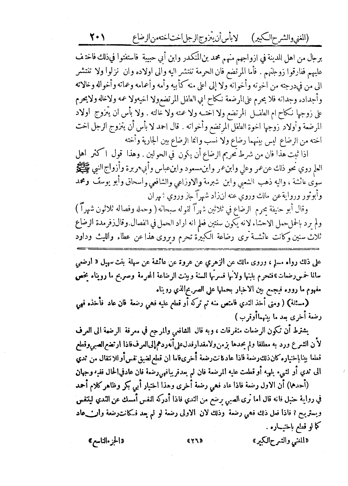 على ذلك رواه مسلم، وروى مالك عن الزهري عن عروة عن عائشة عن سهلة بنت سهيل " أرضعي سالماً خمس رضعات " فتحرم بلبنها ولأنها فسرتها السنة وبينت الرضاعة المحرمة وصريح ما رويناه يخص مفهوم ما رووه فيجمع بين الأخبار بحملها على الصريح الذي رويناه (مسألة) (ومتى أخذ الثدي فامتص منه ثم تركه أو قطع فهي رضعة فإن عاد فأخذه فهي رضعة أخرى بعد ما بينهما أو قرب) يشترط أن تكون الرضعات متفرقات، وبه قال الشافعي والمرجع في معرفة الرضعة إلى العرف لأن الشرع ورد به مطلقاً ولم يحدها بزمن ولا مقدار فدل على أنه ردهم إلى العرف فإذا ارتضع الصبي وقطع قطعا بينا باختياره كان ذلك رضعة فإذا عاد كانت رضعة أخرى فأما إن قطع لضيق نفس أو للانتقال من ثدي إلى ثدي أو لشئ يلهيه أو قطعت عليه المرضعة فإن لم يعد قريباً فهي رضعة فإن عاد في الحال ففيه وجهان (أحدهما) أن الأول رضعة فإذا عاد فهي رضعة أخرى وهذا اختيار أبي بكر وظاهر كلام أحمد