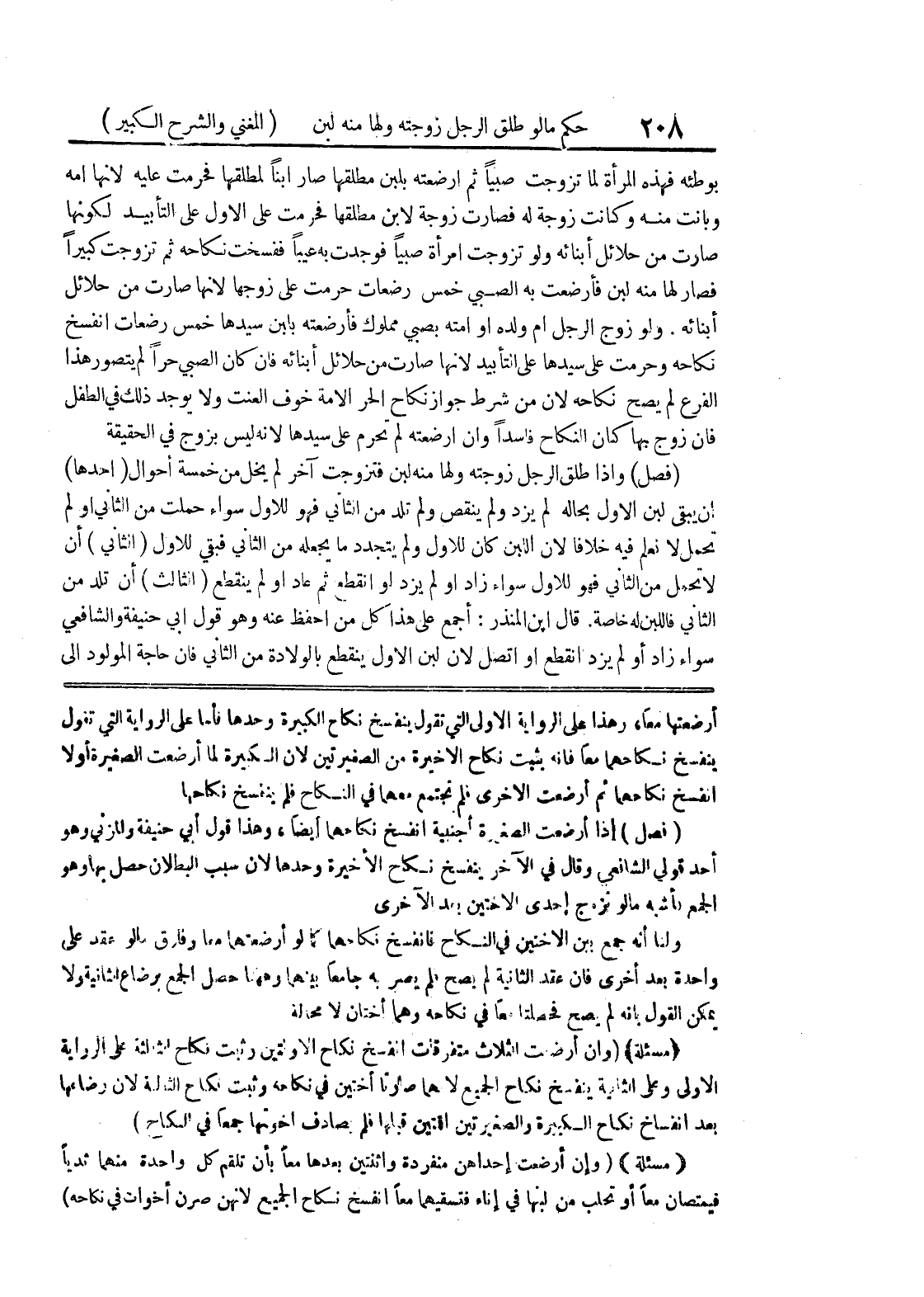 أرضعتها معاً، وهذا على الرواية الأولى التي تقول ينفسخ نكاح الكبيرة وحدها فأما على الرواية التي تقول ينفسخ نكاحهما معاً فإنه يثبت نكاح الأخيرة من الصغيرتين لأن الكبيرة لما أرضعت الصغيرة أولا انفسخ نكاحها ثم أرضعت الأخرى فلم تجتمع معهما في النكاح فلم ينفسخ نكاحها (فصل) إذا أرضعت الصغيرة أجنبية انفسخ نكاحهما أيضاً، وهذا قول أبي حنيفة والمزني وهو أحد قولي الشافعي وقال في الآخر ينفسخ نكاح الأخيرة وحدها لأن سبب البطلان حصل بها وهو الجمع فأشبه ما لو تزوج إحدى الأختين بعد الأخرى ولنا أنه جمع بين الأختين في النكاح فانفسخ نكاحهما كما لو أرضعتهما معاً وفارق ما لو عقد على واحدة بعد أخرى فإن عقد الثانية لم يصح فلم يصير به جامعاً بينهما وههنا حصل الجمع برضاع الثانية ولا يمكن القول بأنه لم يصح فحصلتا معاً في نكاحه وهما أختان لا محالة (مسألة) (وإن أرضعت الثلاث متفرقات انفسخ نكاح الأولتين وثبت نكاح الثالثة على الرواية الأولى وعلى الثانية ينفسخ نكاح الجميع لأنهما صارتا أختين في نكاحه وثبت نكاح الثالثة لأن رضاعها بعد انفساخ نكاح الكبيرة والصغيرتين اللتين قبلها فلم يصادف اخوتها جمعاً في النكاح) (مسألة) (وأن أرضعت إحداهن منفردة واثنتين بعدها معاً بأن تلقم كل واحدة منهما ثدياً فيمتصان معاً أو تحلب من لبنها في إناء فتسقيهما معاً انفسخ نكاح الجميع لأنهن صرن أخوات في نكاحه)