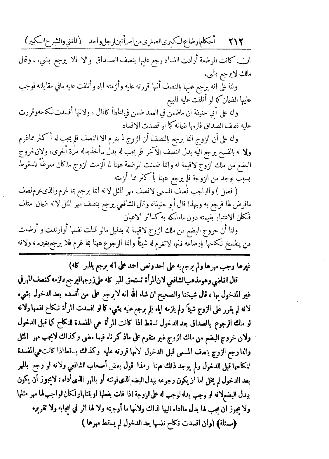 لو ملك الرجوع بالصداق بعد الدخول لسقط إذا كانت المرأة هي المفسدة للنكاح كما قبل الدخول ولأن خروج البضع من ملك الزوج غير متقوم على ما ذكرناه فيما مضى وكذلك لا يجب مهر المثل وإنما رجع الزوج بنصف المسمى قبل الدخول لأنها قررته عليه وكذلك يسقط إذا كانت هي المفسدة لنكاحها قبل الدخول ولم يوجد ذلك ههنا وهذا قول بعض أصحاب الشافعي ولأنه لو رجع بالمهر بعد الدخول لم يخل إما أن يكون رجوعه ببدل البضع الذي فوتته أو بالمهر الذي أداه: لا يجوز أن يكون ببدل البضع لأنه لو وجب بدله لوجب له على الزوجة إذا فات بفعلها أو بقتلها ولكان الواجب لها مهر مثلها ولا يجوز أن يجب لها بدل ما أداه إليها لذلك ولأنها ما أوجبته ولا لها أثر في إيجابه ولا تقريره (مسألة) (وإن أفسدت نكاح نفسها بعد الدخول لم يسقط مهرها)