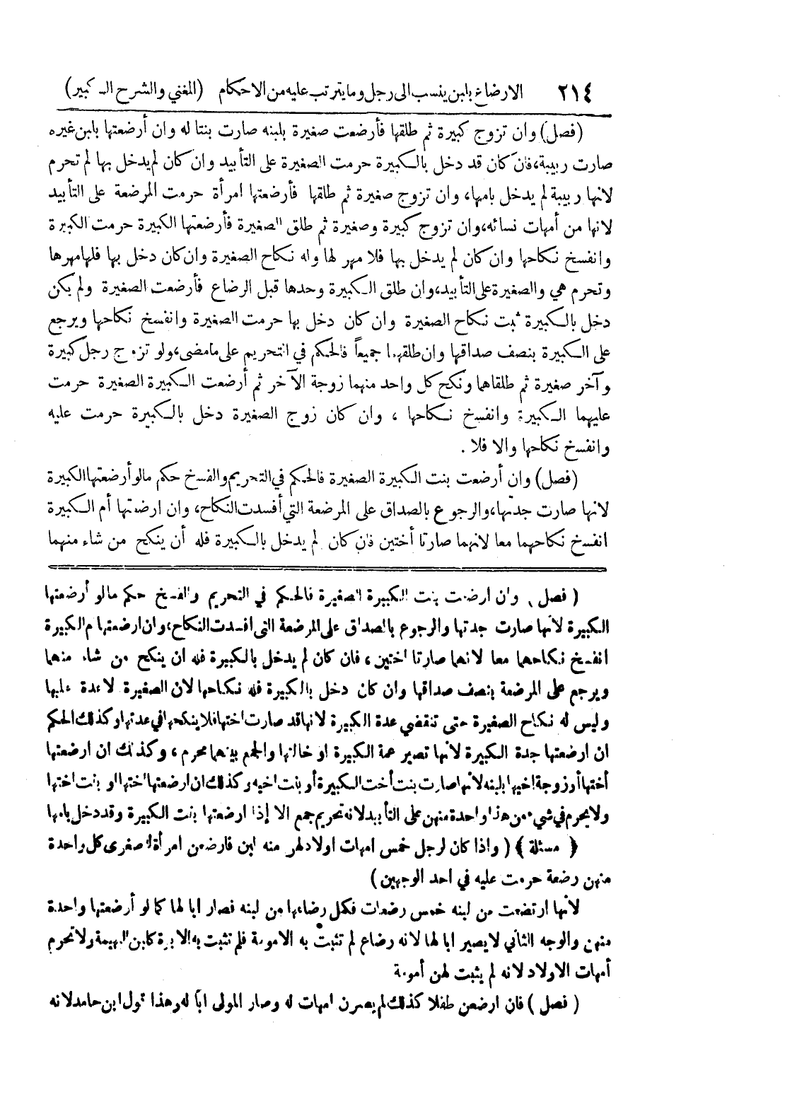 (فصل) وإن أرضعت بنت الكبيرة الصغيرة فالحكم في التحريم والفسخ حكم ما لو أرضعتها الكبيرة لأنها صارت جدتها والرجوع بالصداق على المرضعة التي أفسدت النكاح، وإن ارضعتها أم الكبيرة انفسخ نكاحهما معاً لأنهما صارتا أختين، فإن كان لم يدخل بالكبيرة فله أن ينكح من شاء منهما ويرجع على المرضعة بنصف صداقها وإن كان دخل بالكبيرة فله نكاحها لأن الصغيرة لا عدة عليها وليس له نكاح الصغيرة حتى تنقضي عدة الكبيرة لأنها قد صارت أختها فلا ينكحها في عدتها وكذلك الحكم إن أرضعتها جدة الكبيرة لأنها تصير عمة الكبيرة أو خالتها والجمع بينهما محرم، وكذلك إن أرضعتها أختها أو زوجة أخيها بلبنه لأنها صارت بنت أخت الكبيرة أو بنت أخيه وكذلك إن أرضعتها أختها أو بنت أختها ولا يحرم في شئ من هذا واحدة منهن على التأبيد لانه تحريم جمع إلا إذا ارضعتها بنت الكبيرة وقد دخل بأمها (مسألة) (وإذا كان لرجل خمس أمهات أولاد لهن منه لبن فأرضعن امرأة الصغرى كل واحدة منهن رضعة حرمت عليه في أحد الوجهين) لأنها ارتضعت من لبنه خمس رضعات فكمل رضاعها من لبنه فصار أبا لها كما لو أرضعتها واحدة منهن والوجه الثاني لا يصير أباً لها لأنه رضاع لم تثبت به الأمومة فلم يثبت به الابوة كلبن البهيمة ولا تحرم أمهات الأولاد لأنه لم يثبت لهن أمومة (فصل) فإن أرضعن طفلاً كذلك لم يصرن أمهات له وصار المولى أبا له وهذا قول ابن حامد لأنه