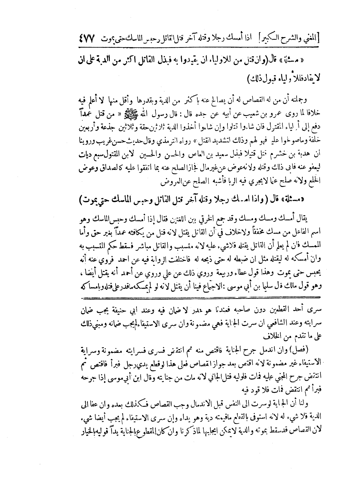 سرى أحد القطعين دون صاحبه فعندنا هو هدر لا ضمان فيه وعند أبي حنيفة يجب ضمان سرايته وعند الشافعي أن سرت الجناية فهي مضمونة وإن سرى الاستيفاء لم يجب ضمانه ومبنى ذلك على ما تقدم من الخلاف (فصل) وإن اندمل جرح الجناية فاقتص منه ثم انتقض فسرى فسرايته مضمونة وسراية الاستيفاء غير مضمونة لأنه إقتص بعد جواز القصاص فعلى هذا لو قطع يدي رجل فبرأ فاقتص ثم انتقض جرح المجني عليه فمات فلوليه الجاني لأنه مات من جنايته وقال ابن أبي موسى إذا جرحه فبرأ ثم انتقض فمات فلا قود فيه ولنا أن الجناية لو سرت إلى النفس قبل الاندمال وجب القصاص فكذلك بعده وان عفا الى الدية فلا شئ له لأنه استوفى بالقطع ما قيمته دية وهو يداه وإن سرى الاستيفاء لم يجب ايضاً شئ لأن القصاص قد سقط بموته والدية لا يمكن ايجابها لما ذكرنا وإن كان المقطوع بالجناية يدا قوليه بالخيار