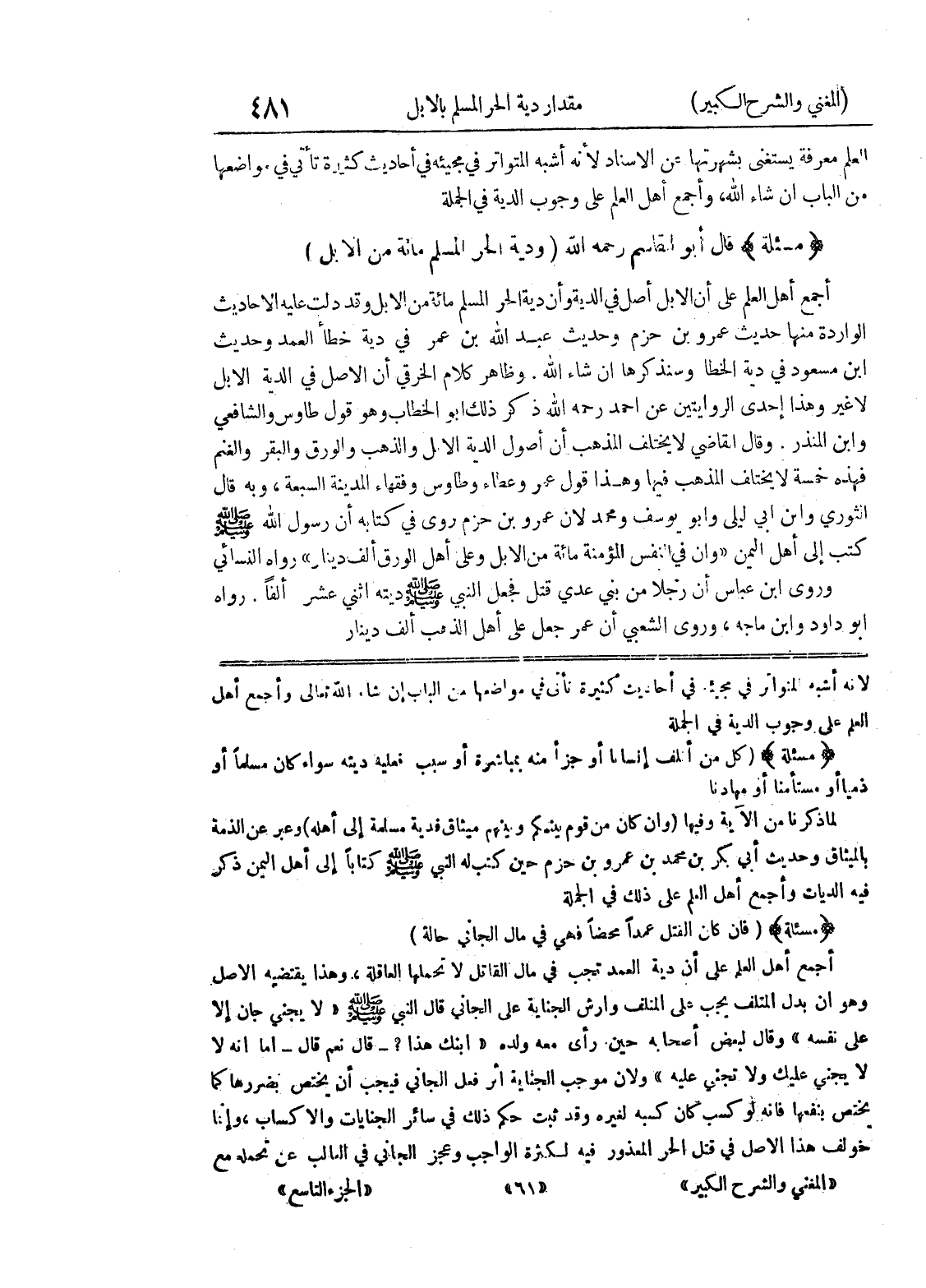 العلم على وجوب الدية في الجملة (مسألة) (كل من أتلف إنساناً أو جزأ منه بمباشرة أو سبب فعليه ديته وسواء كان مسلماً أو ذمياً أو مستأمناً أو مهادناً لما ذكرنا من الآية وفيها (وإن كان من قوم بينكم وبينهم ميثاق فدية مسلمة إلى أهله) وعبر عن الذمة بالميثاق وحديث أبي بكر بن محمد بن عمرو بن حزم حين كتب له النبي صلى الله عليه وسلم كتابا إلى أهل اليمن ذكر فيه الديات وأجمع أهل العلم عن ذلك في الجملة (مسألة) (فإن كان القتل عمداً محضاً فهي في مال الجاني حالة) أجمع أهل العلم على أن دية العمد تجب في مال القاتل لا تحملها العاقلة، وهذا يقتضيه الأصل وهو أن بدل المتلف يجب على المتلف وأرش الجناية على الجاني قال النبي صلى الله عليه وسلم " لا يجني جان إلا على نفسه " وقال لبعض أصحابه حين رأى معه ولده " ابنك هذا؟ - قال نعم قال - أما إنه لا لا يجني عليك ولا تجني عليه " ولأن موجب الجناية أثر فعل الجاني فيجب أن يختص بضررها كما يختص بنفعها فإنه لو كسب كان كسبه لغيره وقد ثبت حكم ذلك في سائر الجنايات والاكساب، وإنما خولف هذا الأصل في قتل الحر المعذور فيه لكثرة الواجب وعجز الجاني في الغالب عن تحمله مع