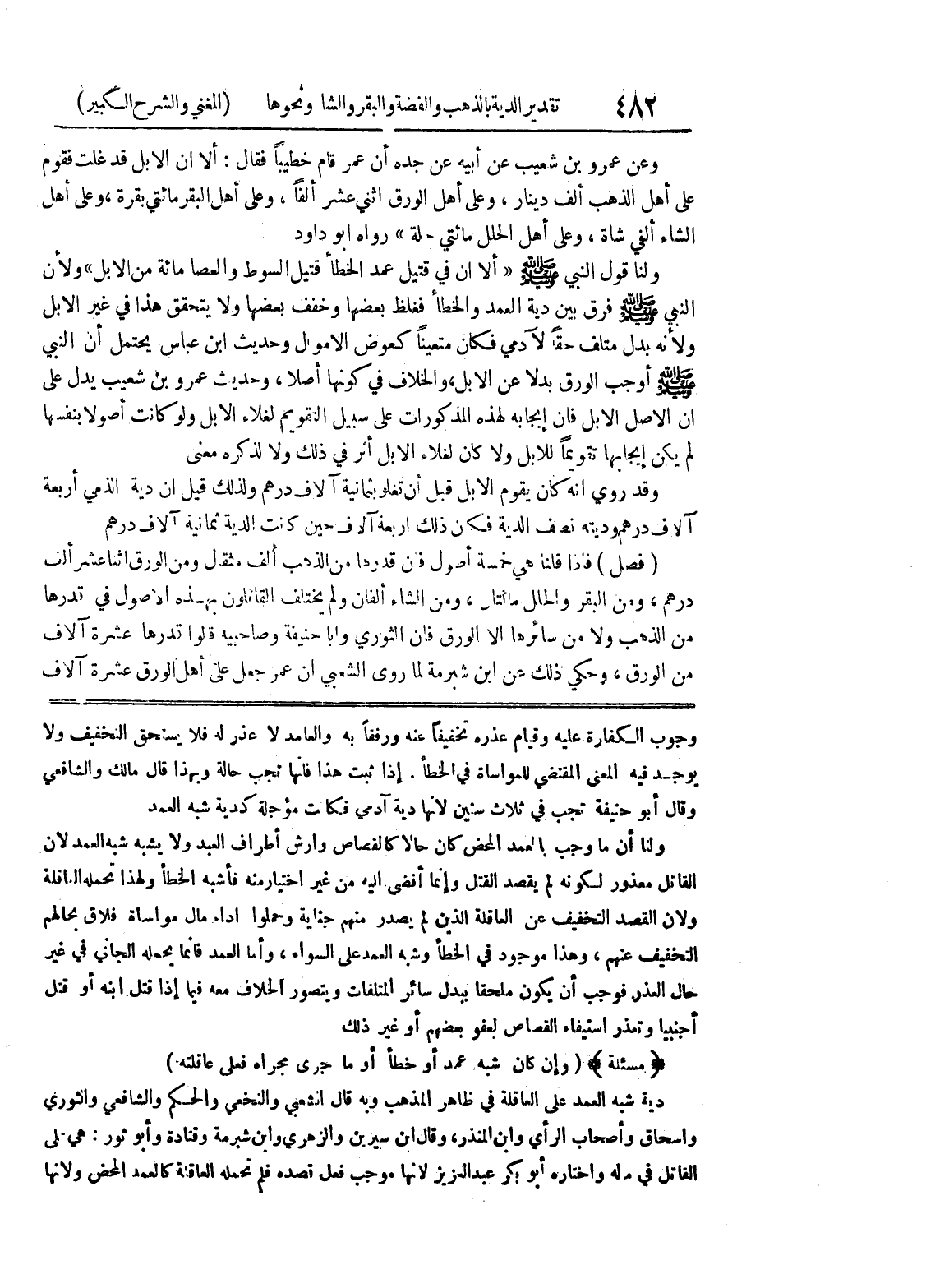 اجنبياً وتعذر استيفاء القصاص لعفو بعضهم أو غير ذلك (مسألة) (وإن كان شبه عمد أو خطأ او ما جرى مجراه فعلى عاقلته) دية شبه العمد على العاقلة في ظاهر المذهب وبه قال الشعبي والنخعي والحكم والشافعي والثوري واسحاق وأصحاب الرأي وابن المنذر، وقال ابن سيرين والزهري وإبن شبرمة وقتادة وأبو ثور: هي على القاتل في ماله واختاره أبو بكر عبد العزيز لأنها موجب فعل قصده فلم تحمله العاقلته كالعمد المحض ولأنها