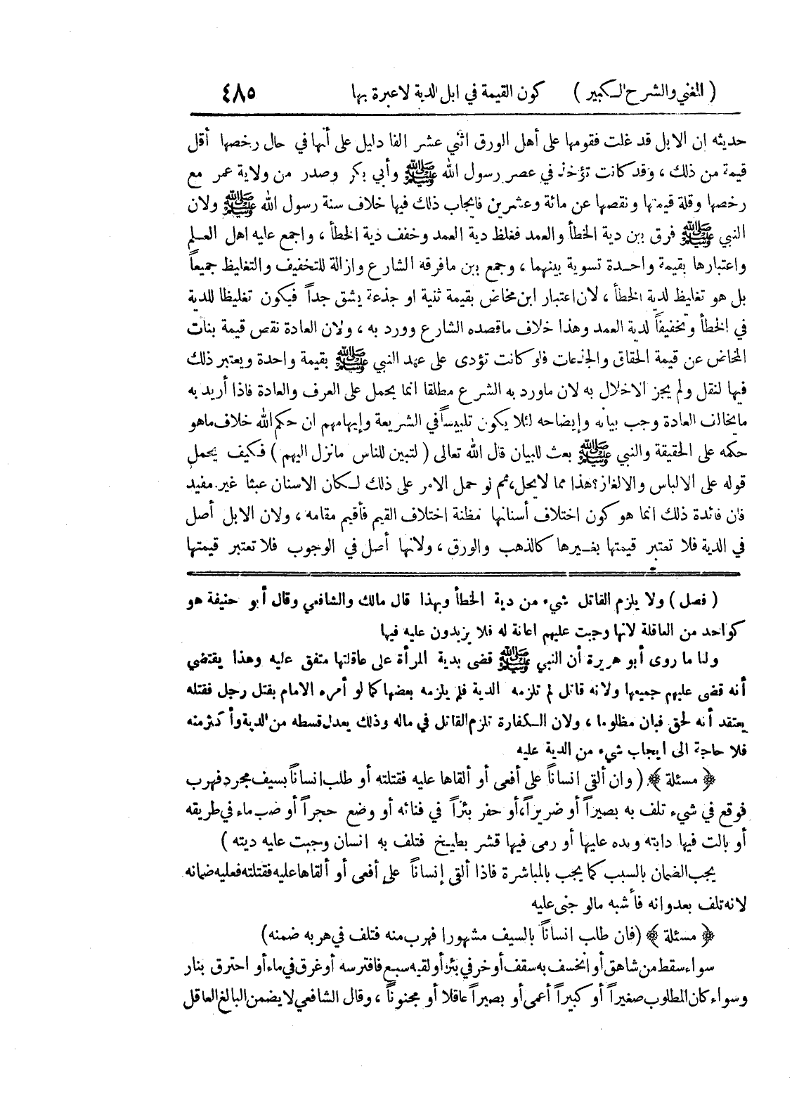 (فصل) ولا يلزم القاتل شئ من دية الخطأ وبهذا قال مالك والشافعي وقال أبو حنيفة هو كواحد من العاقلة لأنها وجبت عليهم إعانة له فلا يزيدون عليه فيها ولنا ما روى أبو هريرة أن النبي صلى الله عليه وسلم قضى بدية المرأة على عاقلتها متفق عليه وهذا يقتضي أنه قضى عليهم جميعها ولأنه قاتل لم تلزمه الدية فلم يلزمه بعضها كما لو أمره الإمام بقتل رجل فقتله يعتقد أنه لحق فبان مظلوماً، ولأن الكفارة تلزم القاتل في ماله وذلك يعدل قسطه من الدية وأكثر منه فلا حاجة الى إيجاب شئ من الدية عليه (مسألة) (وإن القى انسانا على أفعى أو ألقاها عليه فقتلته أو طلب انسانا بسيف مجرد فهرب فوقع في شئ تلف به بصيراً أو ضريراً، أو حفر بئراً في فنائه أو وضع حجراً أو صب ماء في طريقه أو بالت فيها دابته ويده عليها أو رمى فيها قشر بطيخ فتلف به إنسان وجبت عليه ديته)