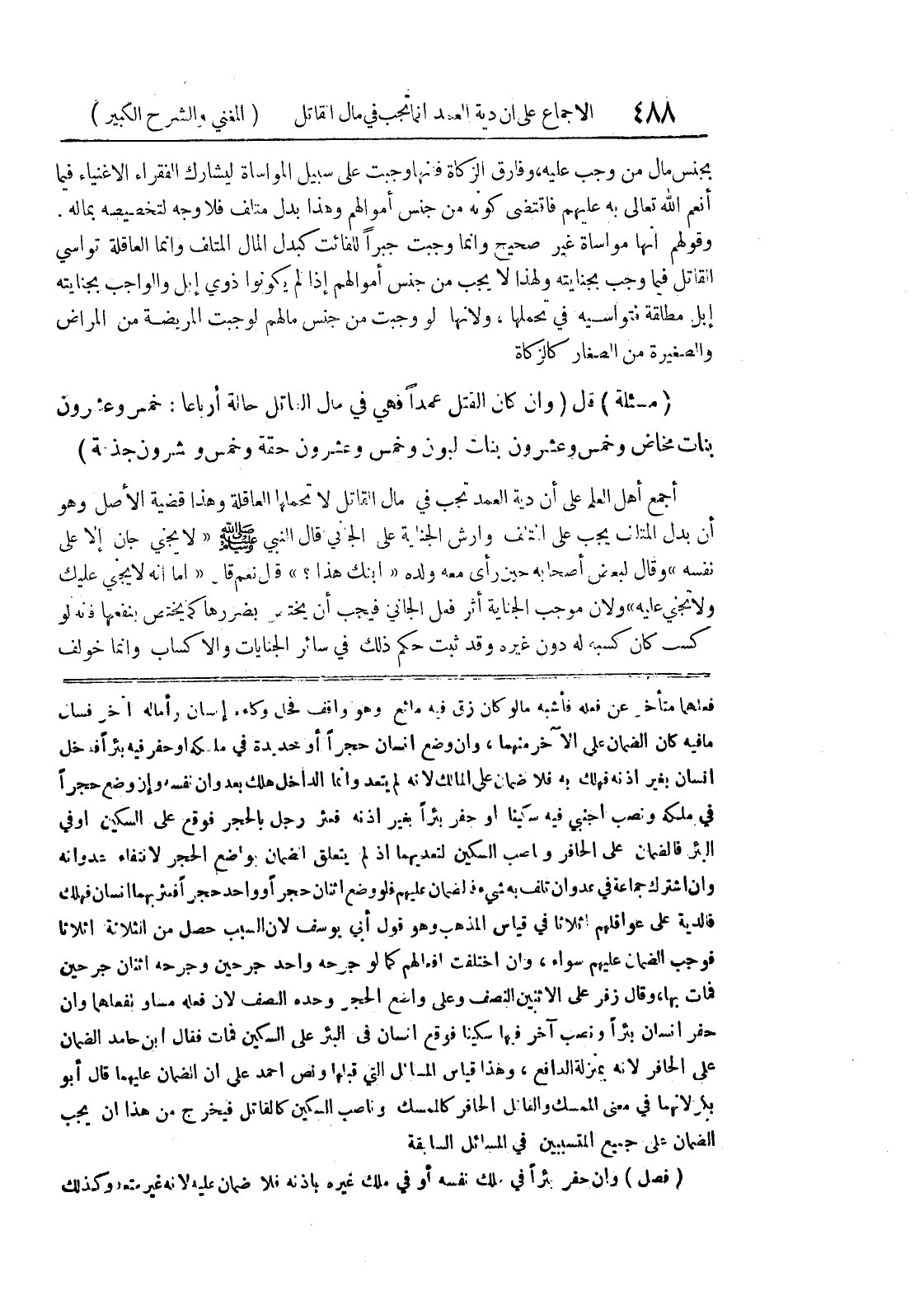 حفر انسان بئراً ونصب آخر فيها سكيناً فوقع انسان في البئر على السكين فمات فقال ابن حامد الضمان على الحافر لأنه بمنزلة الدافع:، وهذا قياس المسائل التي قبلها ونص أحمد على أن الضمان عليهما قال أبو بكر لأنهما في معنى الممسك والقاتل الحافر كالممسك وناصب السكين كالقاتل فيخرج من هذا أن يجب الضمان على جميع المتسببين في المسائل السابقة (فصل) وان حفر بئراً في ملك نفسه أو في ملك غيره بإذنه فلا ضمان عليه لأنه غير متعد وكذلك