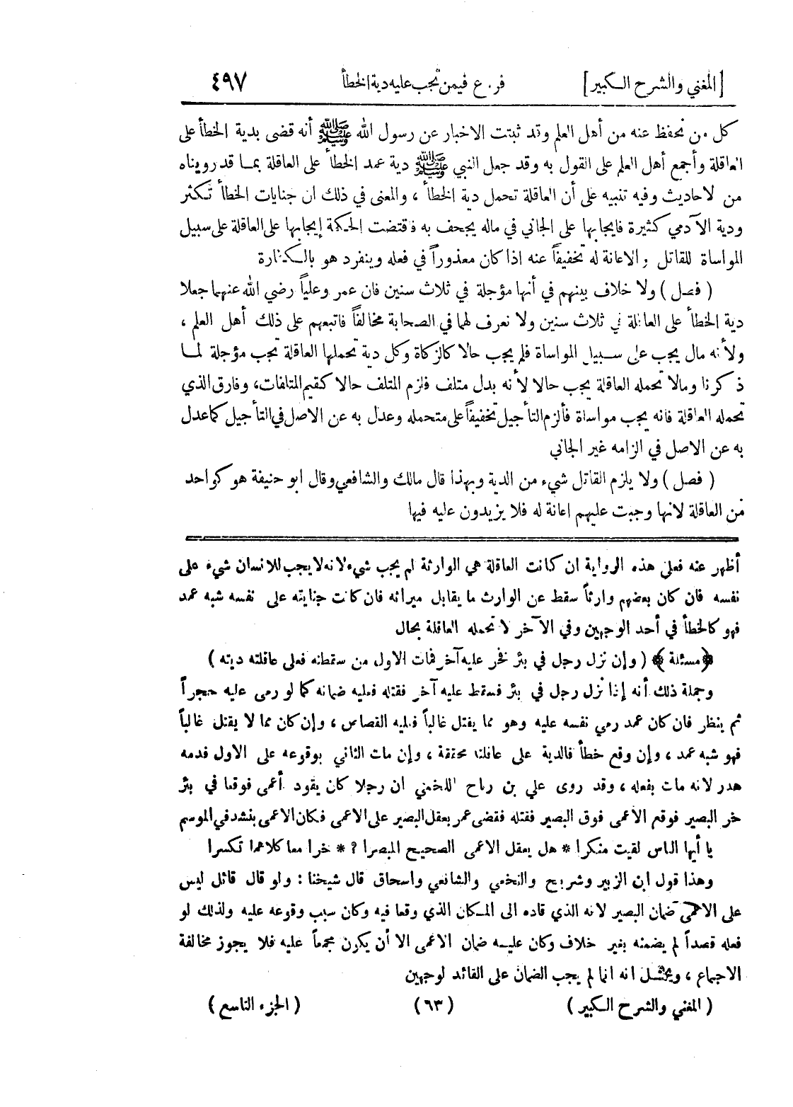 فهو شبه عمد، وإن وقع خطأ فالدية على عاقلته محققة، وإن مات الثاني بوقوعه على الأول فدمه هدر لأنه مات بفعله، وقد روى علي بن رباح اللخمي أن رجلاً كان يقود أعمى فوقعا في بئر خر البصير فوقع الأعمى فوق البصير فقتله فقضى عمر بعقل البصير على الأعمى فكان الاعمى بنشد في الموسم يا أيها الناس لقيت منكرا * هل يعقل الأعمى الصحيح المبصرا؟ * خرا معاً كلاهما تكسرا وهذا قول ابن الزبير وشريح والنخعي والشافعي وإسحاق قال شيخنا: ولو قال قاتل ليس على الأعمى ضمان البصير لأنه الذي قاده الى المكان الذي وقعا فيه وكان سبب وقوعه عليه ولذلك لو فعله قصداً لم يضمنه بغير خلاف وكان عليه ضمان الأعمى إلا أن يكون مجمعاً عليه فلا يجوز مخالفة الاجماع، ويحتمل أنه إنما لم يجب الضمان على القائد لوجهين