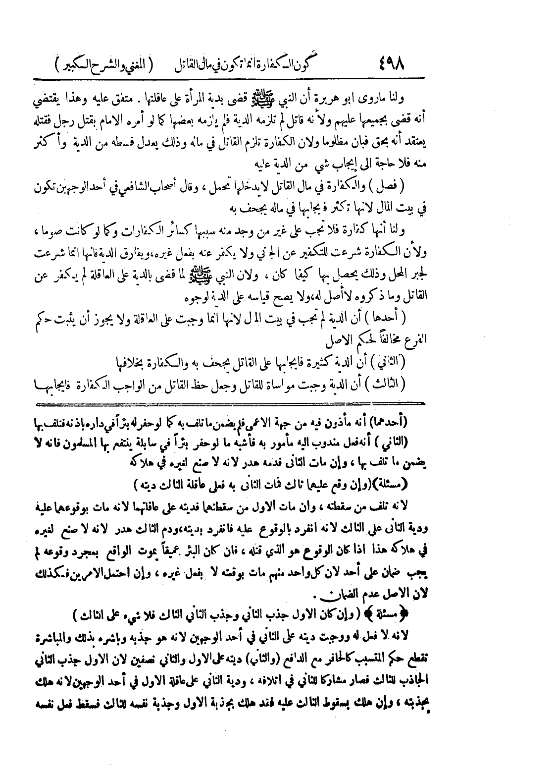 (أحدهما) أنه مأذون فيه من جهة الاعمى فلم يضمن ما تلف به كما لو حفر له بئراً في داره بإذنه فتلف بها (الثاني) أنه فعل مندوب اليه مأمور به فأشبه ما لو حفر بئراً في سابلة ينتفع بها المسلمون فإنه لا يضمن ما تلف، بها وإن مات الثاني فدمه هدر لأنه لا صنع لغيره في هلاكه (مسألة) (وإن وقع عليهما ثالث فمات الثاني به فعلى عاقلة الثالث ديته) لأنه تلف من سقطته، وإن مات الأول من سقطتهما فديته على عاقلتهما لأنه مات بوقوعهما عليه ودية الثاني على الثالث لأنه انفرد بالوقوع عليه فانفرد بديته، ودم الثالث هدر لأنه لا صنع لغيره في هلاكه هذا إذا كان الوقوع هو الذي قتله، فإن كان البئر عميقاً يموت الواقع بمجرد وقوعه لم يجب ضمان على أحد لأن كل واحد منهم مات بوقعته لا بفعل غيره، وإن احتمل الأمرين فكذلك لأن الأصل عدم الضمان.
