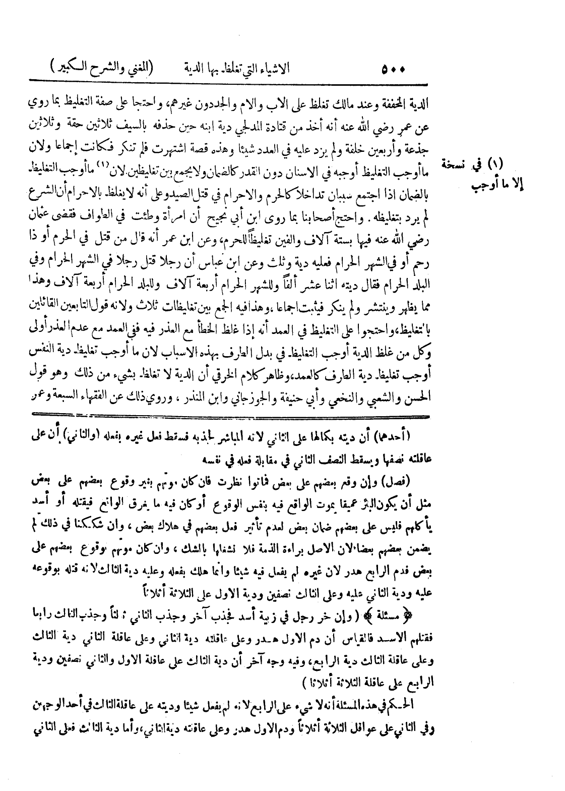 بعض فدم الرابع هدر لأن غيره لم يفعل فيه شيئا وإنما هلك بفعله وعليه دية الثالث لأنه قتله بوقوعه عليه ودية الثاني عليه وعلى الثالث نصفين ودية الأول على الثلاثة أثلاثاً (مسألة) (وإن خر رجل في زبية أسد فجذب آخر وجذب الثاني، ثالثاً وجذب الثالث رابعاً فقتلهم الأسد فالقياس أن دم الأول هدر وعلى عاقلته دية الثاني وعلى عاقلة الثاني دية الثالث وعلى عاقلة الثالث دية الرابع، وفيه وجه آخر أن دية الثالث على عاقلة الأول والثاني نصفين ودية الرابع على عاقلة الثلاثة أثلاثا) الحكم في هذه المسألة أنه لا شئ على الرابع لأنه لم يفعل شيئاً وديته على عاقلة الثالث في أحد الوجهين وفي الثاني على عواقل الثلاثة أثلاثاً ودم الأول هدر وعلى عاقلته دية الثاني، وأما دية الثالث فعلى الثاني