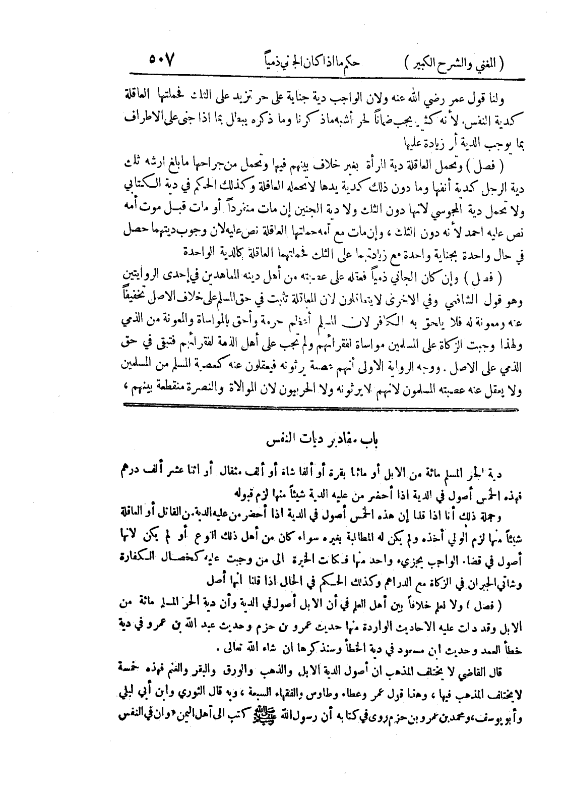 باب مقادير ديات النفس دية الحر المسلم مائة من الإبل أو مائتا بقرة أو ألفا شاة ألف مثقال أو أثنا عشر ألف درهم فهذه الخمس أصول في الدية إذا أحضر من عليه الدية شيئاً منها لزم قبوله وجملة ذلك أنا إذا قلنا إن هذه الخمس أصول في الدية إذا أحضر من عليه الدية من القاتل أو العاقلة شيئاً منها لزم الولي أخذه ولم يكن له المطالبة بغيره سواء كان من أهل ذلك النوع أو لم يكن لأنها أصول في قضاء الواجب يجزئ واحد منها فكانت الخيرة الى من وجبت عليه كخصال الكفارة وشاتي الجيران في الزكاة مع الدراهم وكذلك الحكم في الحال إذا قلنا إنها أصل (فصل) ولا نعلم خلافاً بين أهل العلم في أن الإبل أصول في الدية وأن دية الحر المسلم مائة من الإبل وقد دلت عليه الأحاديث الواردة منها حديث عمرو بن حزم وحديث عبد الله بن عمر وفي دية