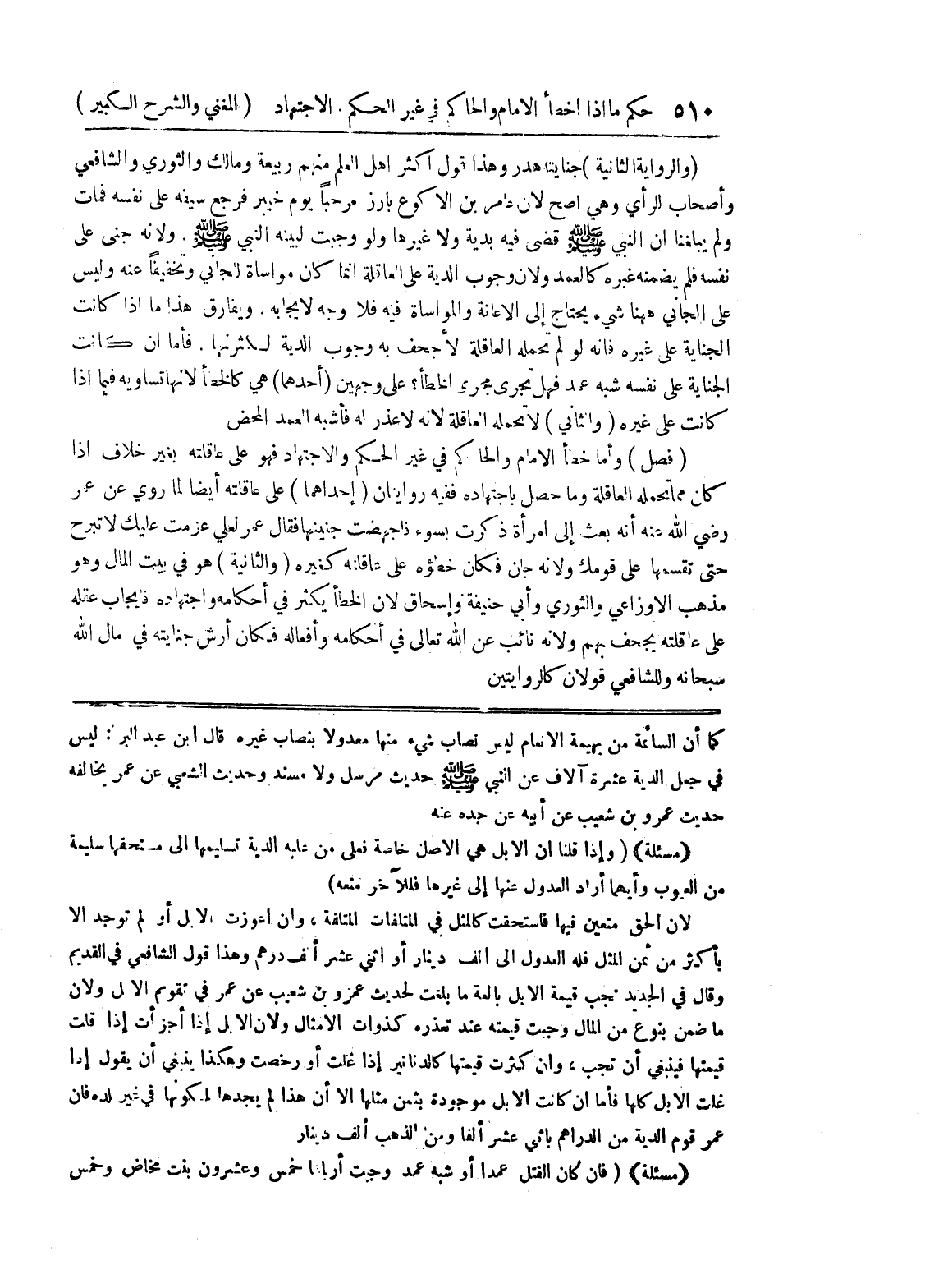 كما أن السائمة من بهيمة الأنعام ليس نصاب شئ منها معدولاً بنصاب غيره قال ابن عبد البر: ليس في جعل الدية عشرة آلاف عن النبي صلى الله عليه وسلم حديث مرسل ولا مسند وحديث الشعبي عن عمر يخالفه حديث عمرو بن شعيب عن أبيه جده عنه (مسألة) (وإذا قلنا إن الإبل هي الأصل خاصة فعلى من عليه الدية تسليمها إلى مستحقها سليمة من العيوب وأيهما أراد العدول عنها إلى غيرها فللآخر منعه) لأن الحق متعين فيها فاستحقت كالمثل في المتلفات المتلفة، وإن اعوزت الإبل أو لم توجد إلا بأكثر من ثمن المثل فله العدول ألى ألف دينار أو اثني عشر ألف درهم وهذا قول الشافعي في القديم وقال في الجديد تجب قيمة الإبل بالغة ما بلغت لحديث عمرو بن شعيب عن عمر في تقويم الإبل ولأن ما ضمن بنوع من المال وجبت قيمته عند تعذره كذوات الأمثال ولأن الإبل إذا أجزأت إذا قلت