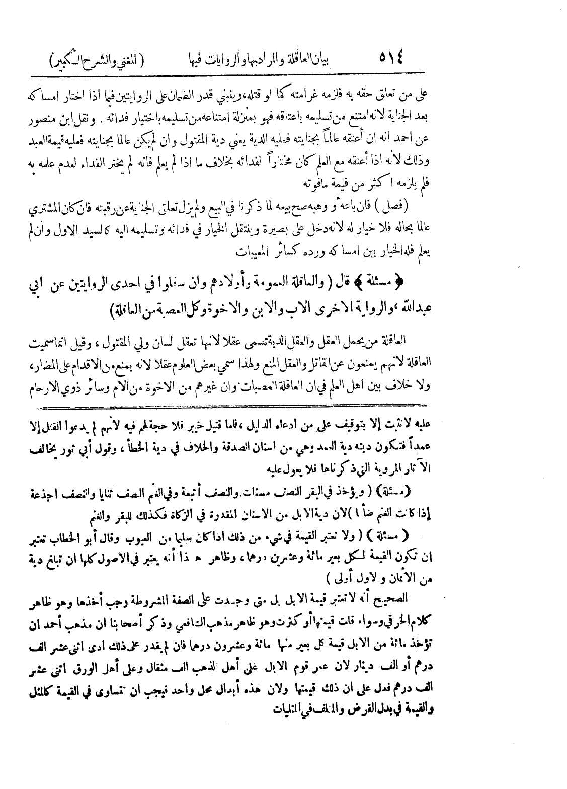 عليه لا نثبت إلا بتوقيف على من ادعاه الدليل، فأما قتيل خيبر فلا حجة لهم فيه لأنهم لم يدعوا القتل إلا عمداً فتكون ديته دية العمد وهي من أسنان الصدقة والخلاف في دية الخطأ، وقول أبي ثور يخالف الآثار المروية التي ذكرناها فلا يعول عليه (مسألة) (ويؤخذ في البقر النصف مسنات والنصف أتبعة وفي الغنم النصف ثنايا والنصف أجذعة إذا كانت الغنم ضأناً) لأن دية الإبل من الاسنان من المقدرة في الزكاة فكذلك للبقر والغنم (مسألة) (ولا تعتبر القيمة في شئ من ذلك إذا كان سليماً من العيوب وقال أبو الخطاب تعتبر أن تكون القيمة لكل بعير مائة وعشرين درهماً، وظاهر هذا أنه يعتبر في الأصول كلها أن تبلغ دية من الأثمان والأول أولى) الصحيح أنه لا تعتبر قيمة الإبل بل متى وجدت على الصفة المشروطية وجب أخذها وهو ظاهر كلام الخرقي وسواء قلت قيمتها أو كثرت وهو ظاهر مذهب الشافعي وذكر أصحابنا أن مذهب احمد ان تؤخذ مائة من الإبل قيمة كل بعير منها مائة وعشرون درهماً فإن لم يقدر على ذلك أدى اثني عشر ألف درهم أو الف دينار لأن عمر قوم الإبل على أهل الذهب ألف مثقال وعلى أهل الورق اثني عشر ألف درهم فدل على أن ذلك قيمتها ولأن هذه أبدال محل واحد فيجب أن تتساوى في القيمة كالمثل والقيمة في بدل القرض المتلف في المثليات