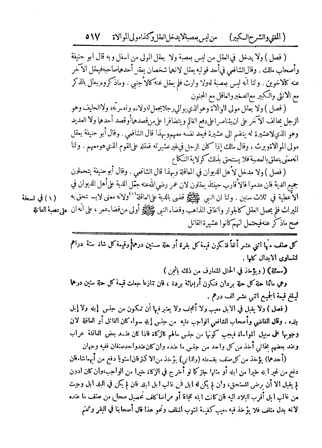 وقال القاضي وأصحاب الشافعي الواجب عليه من جنس إبله سواء كان القاتل أو العاقلة لأن وجوبها على سبيل المواساة فيجب كونها من جنس مالهم كالزكاة فإذا كان عند بعض العاقلة عراب وعند بعضهم نجاتي أخذ من كل واحد من جنس ما عنده وإن كان عند واحد صنفان ففيه وجهان (أحدهما) يؤخذ من كل صنف بقسطه (والثاني) يؤخذ من الأكثر فإن استويا دفع من أيهما شاء فإن دفع من غير إبله خيراً من إبله أو مثلها جاز كما لو أخرج في الزكاة خيراً من الواجب، وان أدون لم يقبل إلا أن يرضي المستحق، وإن لم يكن له إبل فمن غالب إبل البلد فإن لم يكن في البلد إبل وجبت من غالب إبل أقرب البلاد اليه فإن كانت إبله عجافاً أو مراضاً كلف تحصيل صحاح من صنف ما عنده لأنه بدل متلف فلا يؤخذ فيه معيب كقيمة الثوب المتلف ونحو هذا قال أصحابنا في البقر والغنم
