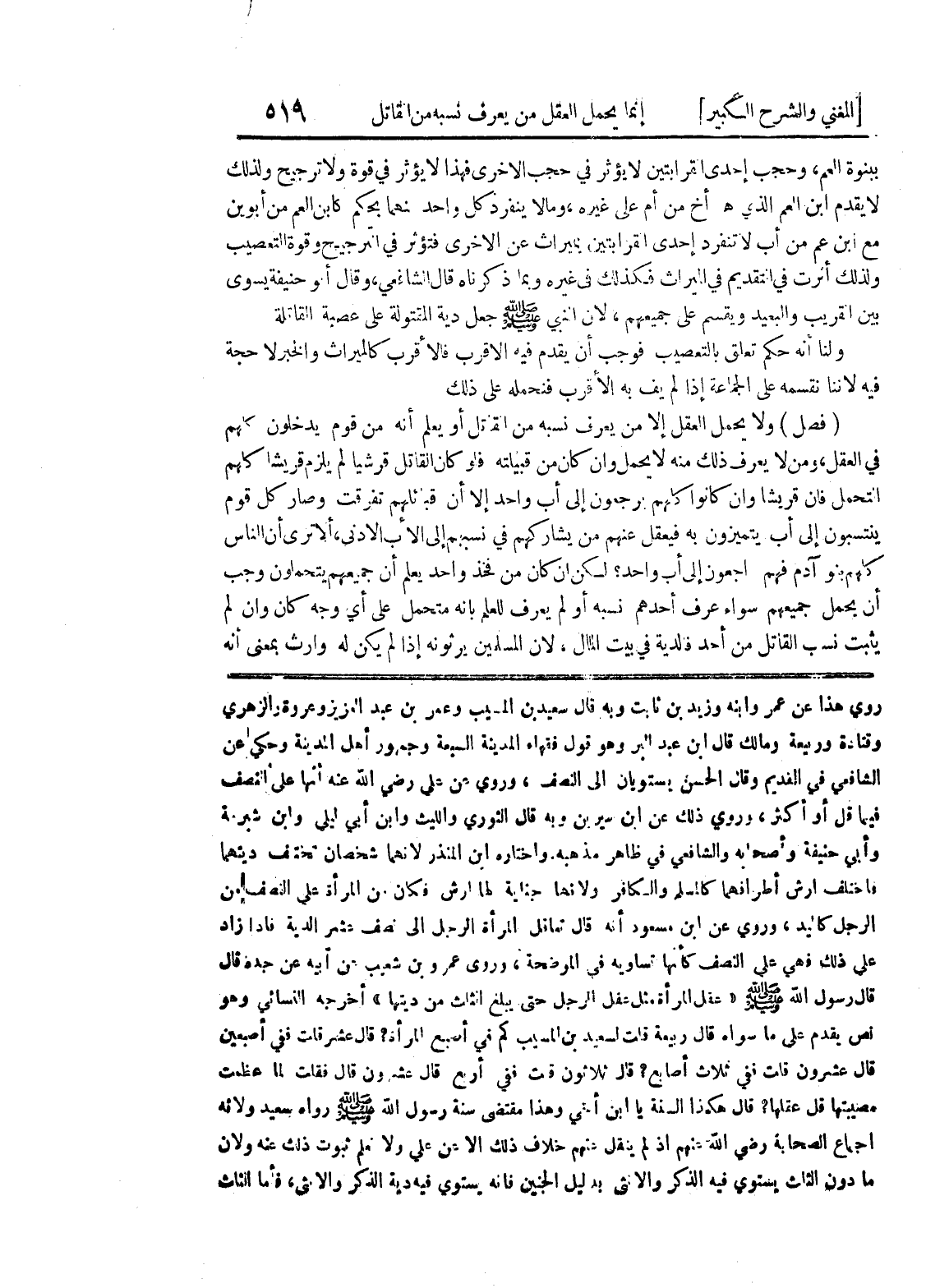 نص يقدم على ما سواه قال ربيعة قلت لسعيد بن المسيب كم في أصبع المرأة؟ قال عشر قلت ففي اصبعين قال عشرون قلت ففي ثلاث أصابع؟ قال ثلاثون قلت ففي أربع قال عشرون قال فقلت لما عظمت مصيبتها قل عقلها؟ قال هكذا السنة يا ابن أخي وهذا مقتضى سنة رسول الله صلى الله عليه وسلم رواه سعيد ولأنه إجماع الصحابة رضي الله عنهم إذ لم ينقل عنهم خلاف ذلك إلا عن علي ولا نعلم ثبوت ذلك عنه ولأن ما دون الثلث يستوي فيه الذكر والأنثى بدليل الجنين فإنه يستوي فيه دية الذكر والأنثى، فأما الثلث
