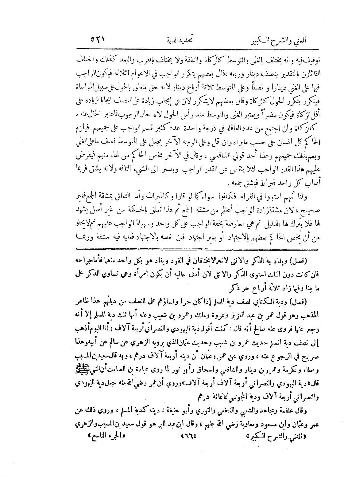 ما بينا وفيما زاد ثلاثة أرباع حر ذكر (فصل) ودية الكتابي نصف دية المسلم إذا كان حراً ونساؤهم على النصف من دياتهم هذا ظاهر المذهب وهو قول عمر بن عبد العزيز وعروة ومالك وعمرو بن شعيب عنه أنها ثلث دية المسلم إلا أنه رجع عنها فروى عنه صالح أنه قال: كنت أقول دية اليهودي والنصراني أربعة آلاف وأنا اليوم أذهب الى نصف دية المسلم حديث عمرو بن شعيب وحديث عثمان الذي يرويه الزهري عن سالم عن ابيه وهذا صريح في الرجوع عنه، وروي عن عمر وعثمان أن ديته أربعة آلاف درهم، وبه قال سعيد بن المسيب وعطاء وعكرمة وعمرو بن دينار والشافعي واسحاق وأبو ثور لما روى عبادة بن الصامت أن النبي صلى الله عليه وسلم قال " دية اليهودي والنصراني أربعة آلاف أربعة آلاف " وروي أن عمر رضي الله عنه جعل دية اليهودي والنصراني أربعة آلاف ودية المجوسي ثمانمائة درهم وقال علقمة ومجاهد والشعبي والنخعي والثوري وأبو حنيفة: ديته كدية المسلم، وروي ذلك عن عمر وعثمان وابن مسعود ومعاوية رضي الله عنهم، وقال ابن عبد البر هو قول سعيد بن المسيب والزهري