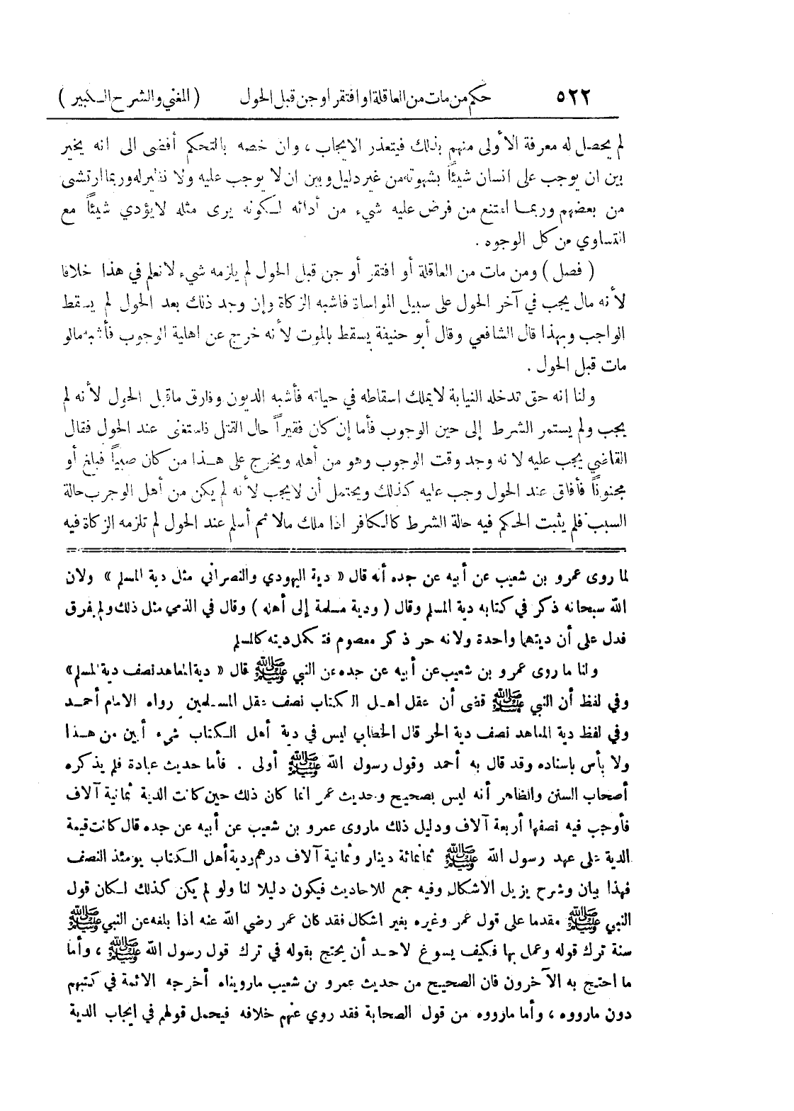 فهذا بيان وشرح يزيل الاشكال وفيه جمع للاحاديث فيكون دليلاً لنا ولو لم يكن كذلك لكان قول النبي صلى الله عليه وسلم مقدماً على قول عمر وغيره بغير إشكال فقد كان عمر رضي الله عنه إذا بلغه عن النبي صلى الله عليه وسلم سنة ترك قوله وعمل بها فكيف يسوغ لأحد أن يحتج بقوله في ترك قول رسول الله صلى الله عليه وسلم، وأما ما احتج به الآخرون فإن الصحيح من حديث عمرو بن شعيب ما رويناه أخرجه الأئمة في كتبهم دون ما رووه، وأما ما رووه من قول الصحابة فقد روي عنهم خلافه فيحمل قولهم في إيجاب الدية