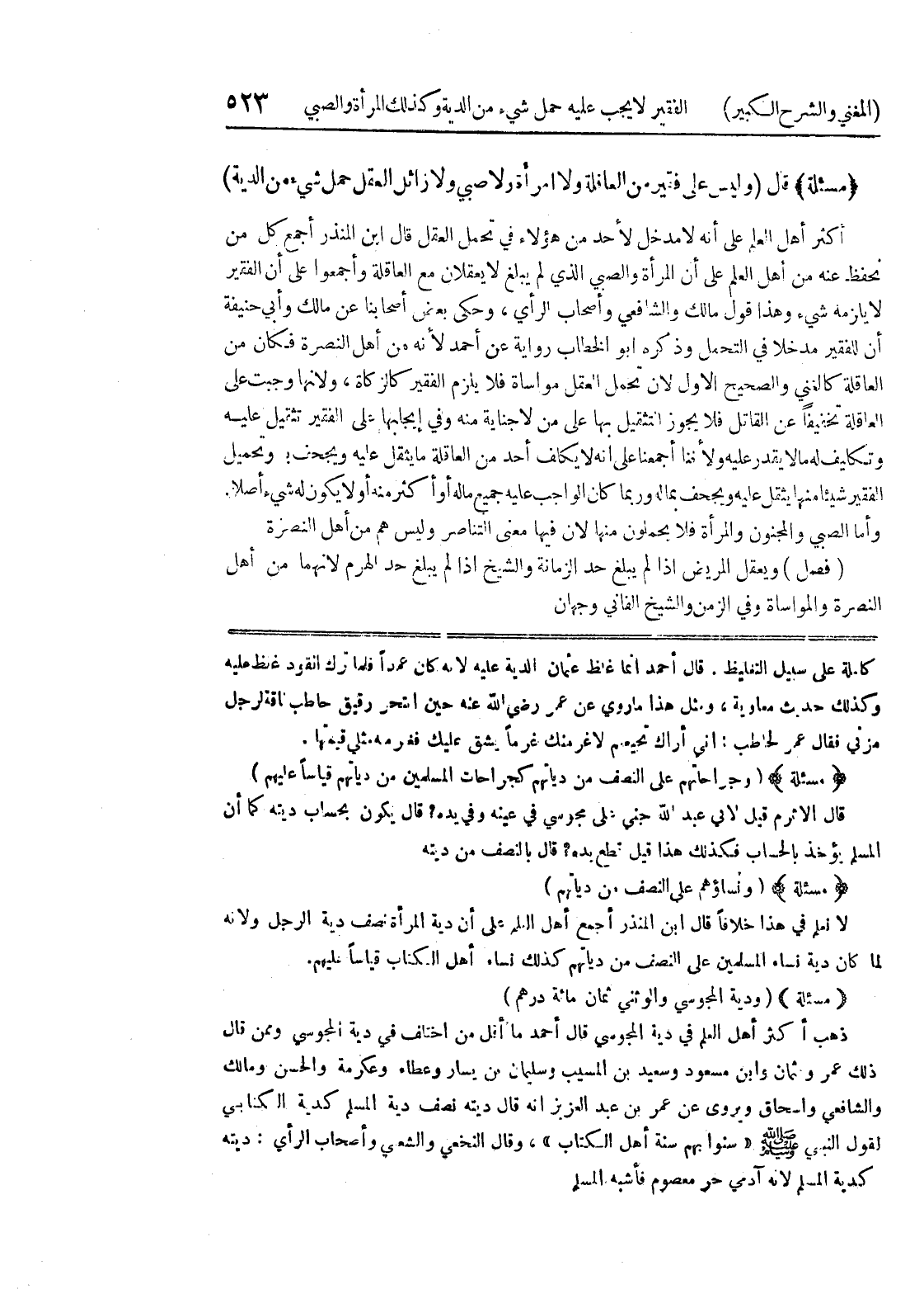 (مسألة) (وجراحاتهم على النصف من دياتهم كجراحات المسلمين من دياتهم قياساً عليهم) قال الأثرم قيل لأبي عبد الله جني على مجوسي في عينه وفي يده؟ قال يكون بحساب ديته كما أن المسلم يؤخذ بالحساب فكذلك هذا قيل قطع يده؟ قال بالنصف من ديته (مسألة) (ونساؤهم على النصف من دياتهم) لا نعلم في هذا خلافاً قال ابن المنذر أجمع أهل العلم على أن دية المرأة نصف دية الرجل ولأنه لما كان دية نساء المسلمين على النصف من دياتهم كذلك نساء أهل الكتاب قياساً عليهم.