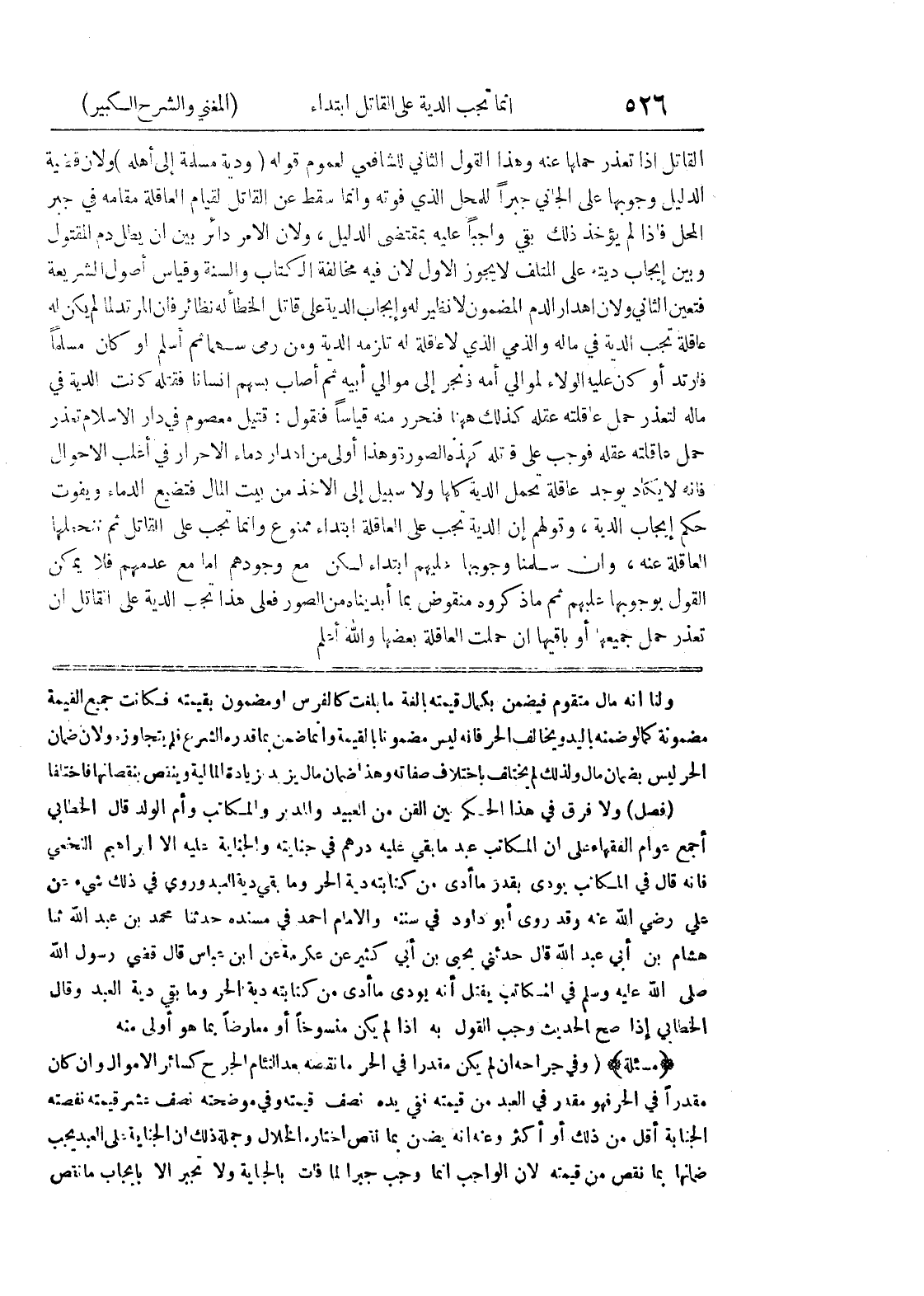 ولنا أنه مال متقوم فيضمن بكمال قيمته بالغة ما بلغت كالفرس او مضمون بقيمته فكانت جميع القيمة مضمونة كما لو ضمنه باليد ويخالف الحر فإنه ليس مضموناً بالقيمة وإنما ضمن بما قدره الشرع فلم يتجاوزه ولأن ضمان الحر ليس بضمان مال ولذلك لم يختلف باختلاف صفاته وهذا ضمان مال يزيد بزيادة المالية وينقص بنقصانها فاختلفا (فصل) ولا فرق في هذا الحكم بين القن من العبيد والمدبر والمكاتب وأم الولد قال الخطابي أجمع عوام الفقهاء على أن المكاتب عبد ما بقي عليه درهم في جنايته والجناية عليه ألا إبراهيم النخعي فإنه قال في المكاتب يودى بقدر ما أدى من كتابة دية الحر وما بقي دية العبد وروي في ذلك شئ عن علي رضي الله عنه وقد روى أبو داود في سننه والإمام أحمد في مسنده حدثنا محمد بن عبد الله ثنا هشام بن أبي عبد الله قال حدثني يحيى بن أبي كثير عن عكرمة عن ابن عباس قال قضى رسول الله صلى الله عليه وسلم في المكاتب يقتل أنه يودى ما أدى من كتابته دية الحر وما بقي دية العبد وقال الخطابي إذا صح الحديث وجب القول به إذا لم يكن منسوخاً أو معارضاً بما هو أولى منه (مسألة) (وفي جراحه إن لم يكن مقدرا ما في الحر ما نقصه بعد التئام الجرح كسائر الأموال وإن كان مقدراً في الحر فهو مقدر في العبد من قيمته ففي يده نصف قيمته وفي موضحة نصف عشر قيمته نقصته الجناية أقل من ذلك أو اكثر وعنه أنه يضمن بما نقص اختاره الخلال وجملة ذلك أن الجناية على العبد يجب ضمانها بما نقص من قيمته لأن الواجب إنما وجب جبراً لما فات بالجناية ولا تجبر إلا بايجاب ما نقص