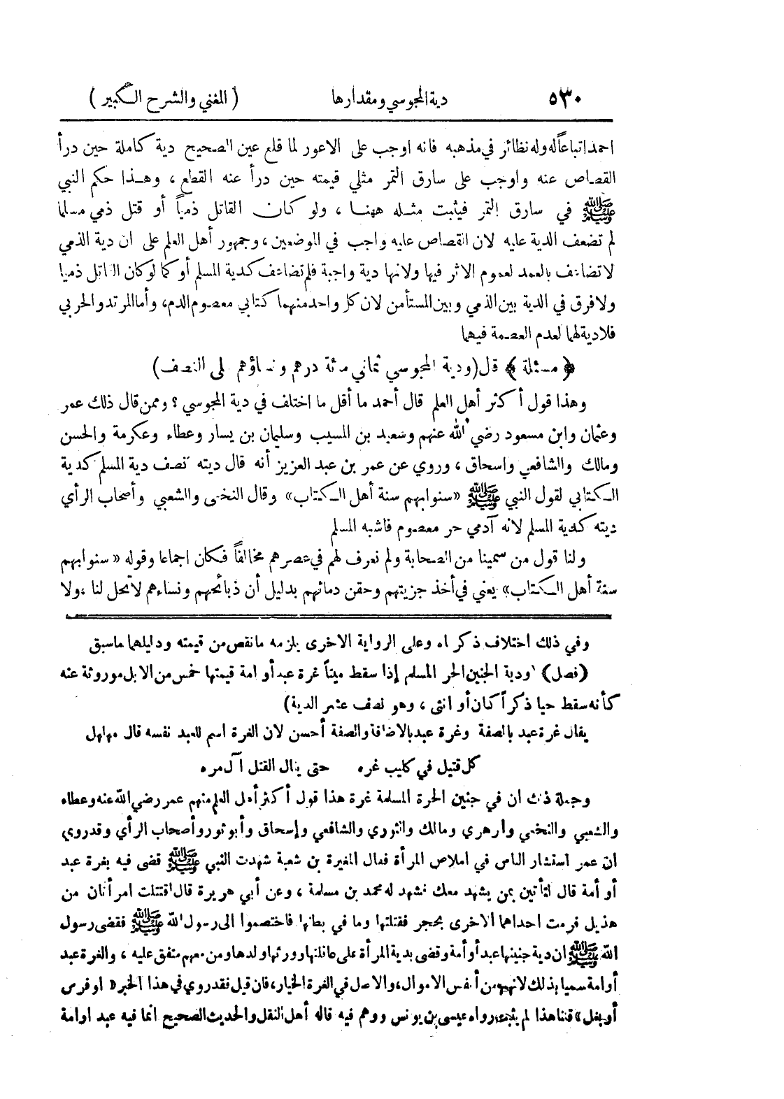 وفي ذلك اختلاف ذكرناه وعلى الرواية الأخرى يلزمه ما نقص من قيمته ودليلهما ما سبق (فصل) (ودية الجنين الحر المسلم إذا سقط ميتاً غرة عبداً أو أمة قيمتها خمس من الإبل مورثة عنه كأنه سقط حيا ذكرا أو انثى، وهو نصف عشر الدية) يقال غرة عبد بالصفة وغرة عبد بالإضافة والصفة أحسن لأن الغرة اسم للعبد نفسه قال مهلهل كل قتيل في كليب غره * حتى ينال القتل آل مره وجملة ذلك أن في جنين المسلمة غرة هذا قول أكثر أهل العلم منهم عمر رضي الله عنه وعطاء والشعبي والنخعي والزهري ومالك والثوري والشافعي واسحاق وأبو ثور وأصحاب الرأي وقد روي أن عمر استشار الناس في املاص المرأة فقال المغيرة بن شعبة شهدت النبي صلى الله عليه وسلم قضى فيه بغرة عبد أو أمة قال لتأتين بمن يشهد معك فشهد له محمد بن مسلمة، وعن أبي هريرة قال اقتتلت امرأتان من هذيل فرمت إحداهما الأخرى بحجر فقتلتها وما في بطنها فاختصموا إلى رسول الله صلى الله عليه وسلم فقضى رسول الله صلى الله عليه وسلم أن دية جنينها عبد أو أمة وقضى بدية المرأة على عاقلتها وورثها ولدها ومن معهم متفق عليه، والغرة عبد أو أمة سميا بذلك لانهن أنفس الاموال، والاصل في الغرة الخيار، فإن قيل فقد روي في هذا الخبر " أو فرس أو بغل " قلنا هذا لم يثبت رواه عيسى بن يونس ووهم فيه قاله أهل النقل والحديث الصحيح إنما فيه عبد أو أمة