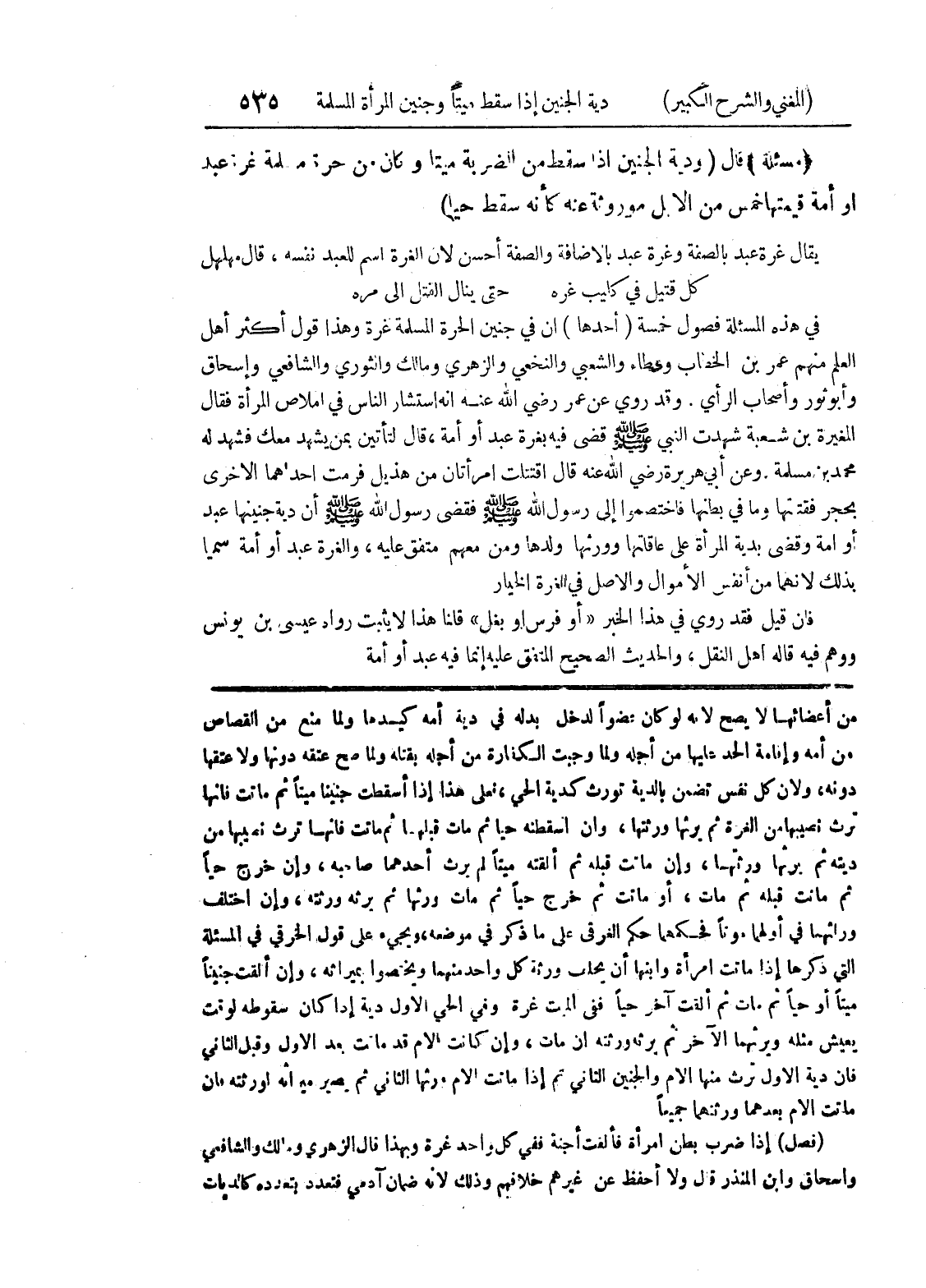 من اعضائها لا يصح لأنه لو كان عضو لدخل بدله في دية أمه كيدها ولما منع من القصاص من أمه وإقامة الحد عليها من أجله ولما وجبت الكفارة من أجله بقتله ولما صح عتقه دونها ولا عتقها دونه، ولأن كل نفس تضمن بالدية تورث كدية الحي، فعلى هذا إذا اسقطت جنينا ميتا ثم ماتت فإنها ترث نصيبها من الغرة ثم يرثها ورثتها، وإن اسقطته حياً ثم مات قبلها ثم ماتت فإنها ترث نصيبها من ديته ثم يرثها ورثتها، وإن ماتت قبله ثم القته ميتاً لم يرث أحدهما صاحبه، وإن خرج حياً ثم ماتت قبله ثم مات، أو ماتت ثم خرج حياً ثم مات ورثها ثم يرثه ورثته، وان اختلف ورائهما في أولهما موتاً فحكمهما حكم الغرقى على ما ذكر في موضعه، ويجئ على قول الخرقي في المسألة التي ذكرها اذا ماتت امرأة وابنها ان يحلف ورثة كل واحد منهما ويختصوا بميراثه، وان ألقت جنيناً ميتاً أو حياً ثم مات ثم ألقت آخر حيا ففي الميت غرة وفي الحي الأول دية إذا كان سقوطه لوقت يعيش مثله ويرثهما الآخر يرثه ورثته ان مات، وإن كانت الأم قد ماتت بعد الأول وقبل الثاني فإن دية الاول ترث منها الأم والجنين الثاني ثم إذا ماتت الام ورثها الثاني ثم يصير ميراثه لورثته فإن ماتت الأم بعدهما ورثتهما جميعاً (فصل) إذا ضرب بطن امرأة فألقت أجنة ففي كل واحد غرة وبهذا قال الزهري ومالك والشافعي وإسحاق وابن المنذر قال لا أحفظ عن غيرهم خلافهم وذلك لأنه ضمان آدمي فتعدد بتعدده كالديات