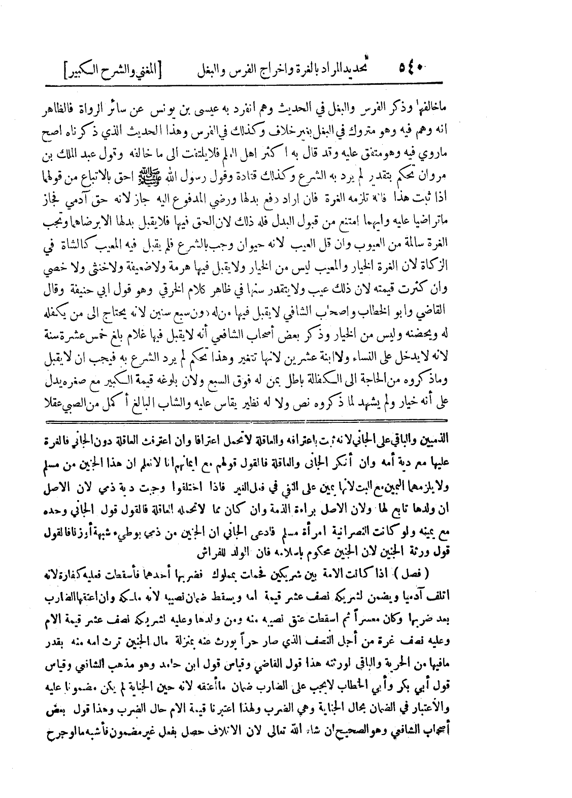الذميين والباقي على الجاني لأنه ثبت باعترافه والعاقلة لا تحمل اعترافاً وإن اعترفت العاقلة دون الجاني فالغرة عليها مع دية امه وان أنكر الجاني والعاقلة فالقول قولهم مع أيمانهم أنا لا نعلم أن هذا الجنين من مسلم ولا يلزمهما اليمين مع البت لأنها يمين على النفي في فعل الغير فإذا اختلفوا وجبت دية ذمي لأن الأصل أن ولدها تابع لها ولأن الأصل براءة الذمة وإن كان مما لا تحمله العاقلة فالقول قول الجاني وحده مع يمينه ولو كانت النصرانية امرأة مسلم فادعى الجاني ان الجنين من ذمي بوطئ شبهة او زنا فالقول قول ورثة الجنين لأن الجنين محكوم بإسلامه فإن الولد للفراش (فصل) إذا كانت الأمة بين شريكين فحملت بمملوك فضربها أحدهما فأسقطت فعليه كفارة لأنه