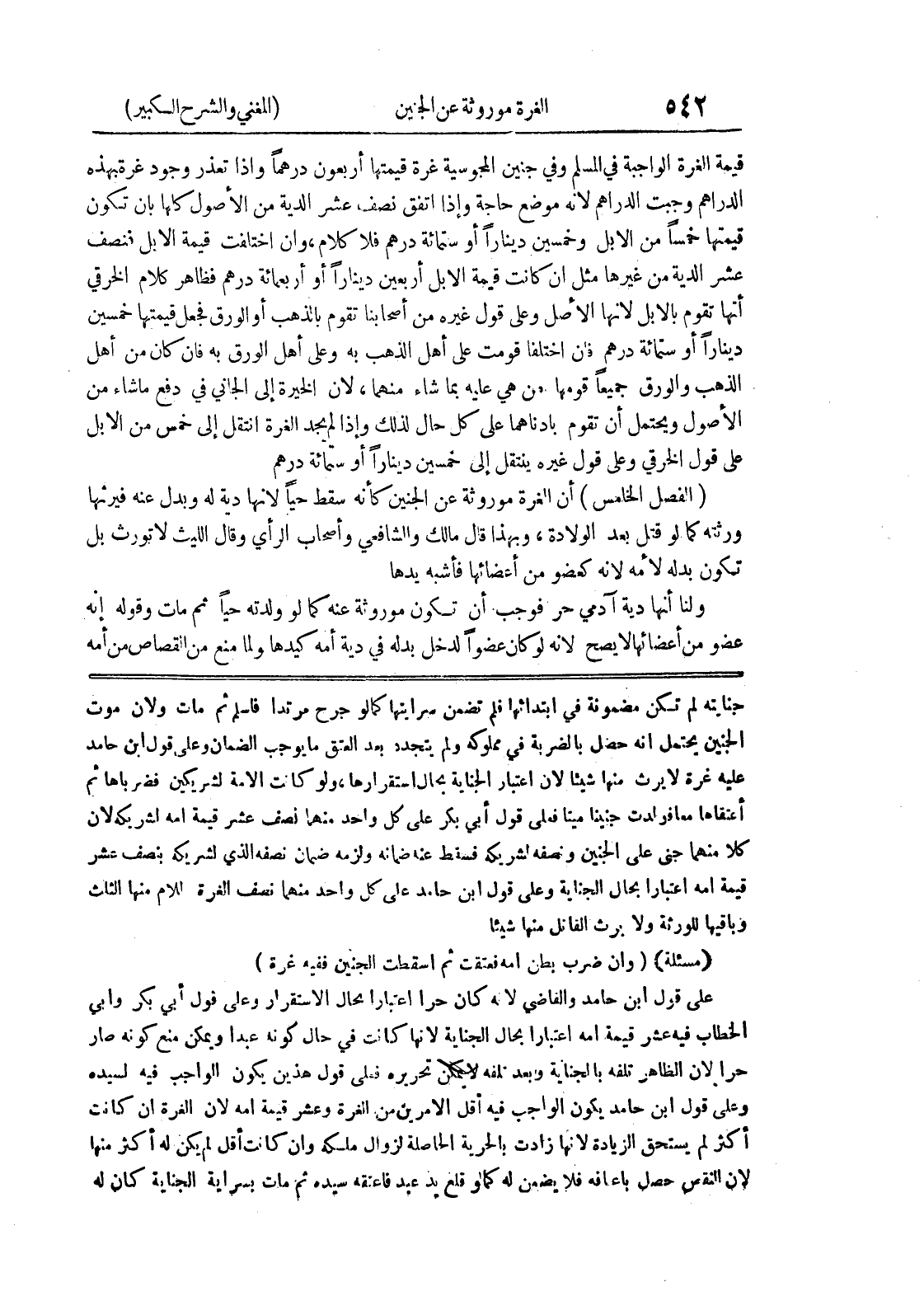 جنايته لم تكن مضمونة في ابتدائها فلم تضمن سرايتها كما لو جرح مرتداً فاسلم ثم مات ولأن موت الجنين يحتمل أنه حصل بالضربة في مملوكه ولم يتجدد بعد العتق ما يوجب الضمان وعلى قول ابن حامد عليه غرة لا يرث منها شيئاً لأن اعتبار الجناية بحال استقرارها، ولو كانت الأمة لشريكين فضرباها ثم أعتقاها معاً فولدت جنيناً ميتاً فعلى قول أبي بكر على كل واحد منهما نصف عشر قيمة أمه لشريكه لأن كلا منهما جنى عليه الجنين ونصفه لشريكه فسقط عنه ضمانه ولزمه ضمان نصفه الذي لشريكه بنصف عشر قيمة أمه اعتباراً بحال الجناية وعلى قول ابن حامد على كل واحد منهما نصف الغرة للأم منها الثلث وباقيها للورثة ولا يرث القاتل منها شيئاً (مسألة) (وإن ضرب بطن أمه فعتقت ثم أسقطت الجنين ففيه غرة) على قول ابن حامد والقاضي لأنه كان حراً اعتباراً بحال الاستقرار وعلى قول أبي بكر وابي الخطاب فيه عشر قيمة أمه اعتباراً بحال الجناية لأنها كانت في حال كونه عبداً ويمكن منع كونه صار حراً لأن الظاهر تلفه بالجناية وبعد تلفه لا يمكن تحريره فعلى قول هذين يكون الواجب فيه لسيده وعلى قول ابن حامد يكون الواجب فيه أقل الأمرين من الغرة وعشر قيمة أمه لأن الغرة إن كانت اكثر لم يستحق الزيادة لأنها زادت بالحرية الحاصلة لزوال ملكه وإن كانت أقل لم يكن له أكثر منها لأن النقص حصل باعافه فلا يضمن له كما لو قلع يد عبد فأعتقه سيده ثم مات بسراية الجناية كان له