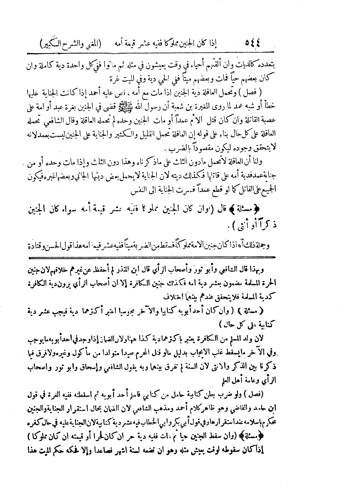 وبهذا قال الشافعي وأبو ثور وأصحاب الرأي قال إبن المنذر لم أحفظ عن غيرهم خلافهم لأن جنين الحرة المسلمة مضمون بعشر دية أمه فكذلك جنين الكافرة إلا أن أصحاب الرأي يرون دية الكافرة كدية المسلمة فلا يتحقق عندهم بينهما اختلاف (مسألة) (وإن كان أحد أبويه كتابياً والآخر مجوسياً اعتبر أكثرهما دية فيجب عشر دية كتابية على كل حال) لأن ولد المسلم من الكافرة يعتبر بأكثرهما دية كذا ههنا ولأن الضمان إذا وجد في أحد أبويه ما يوجب وفي الآخر ما يسقط غلب الإيجاب بدليل ما لو قتل المحرم صيداً متولداً من مأكول وغيره ولا فرق فيما ذكرنا بين الذكر والأنثى لأن السنة لم تفريق بينهما وبه يقول الشافعي وإسحاق وأبو ثور وأصحاب الرأي وعامة أهل العلم (فصل) لو ضرب بطن كتابية حامل من كتابي فأسلم أحد أبويه ثم أسقطته ففيه الغرة في قول ابن حامد والقاضي وهو ظاهر كلام أحمد ومذهب الشافعي لأن الضمان بحال استقرار الجناية والجنين محكوم بإسلامه عند استقرارها وفي قول أبي بكر وابي الخطاب فيه عشر دية كتابية لأن الجناية عليه في حال كفره (مسألة) (وان سقط الجنين حياً ثم مات ففيه دية حر إن كان لحرا أو قيمته أن كان مملوكاً)