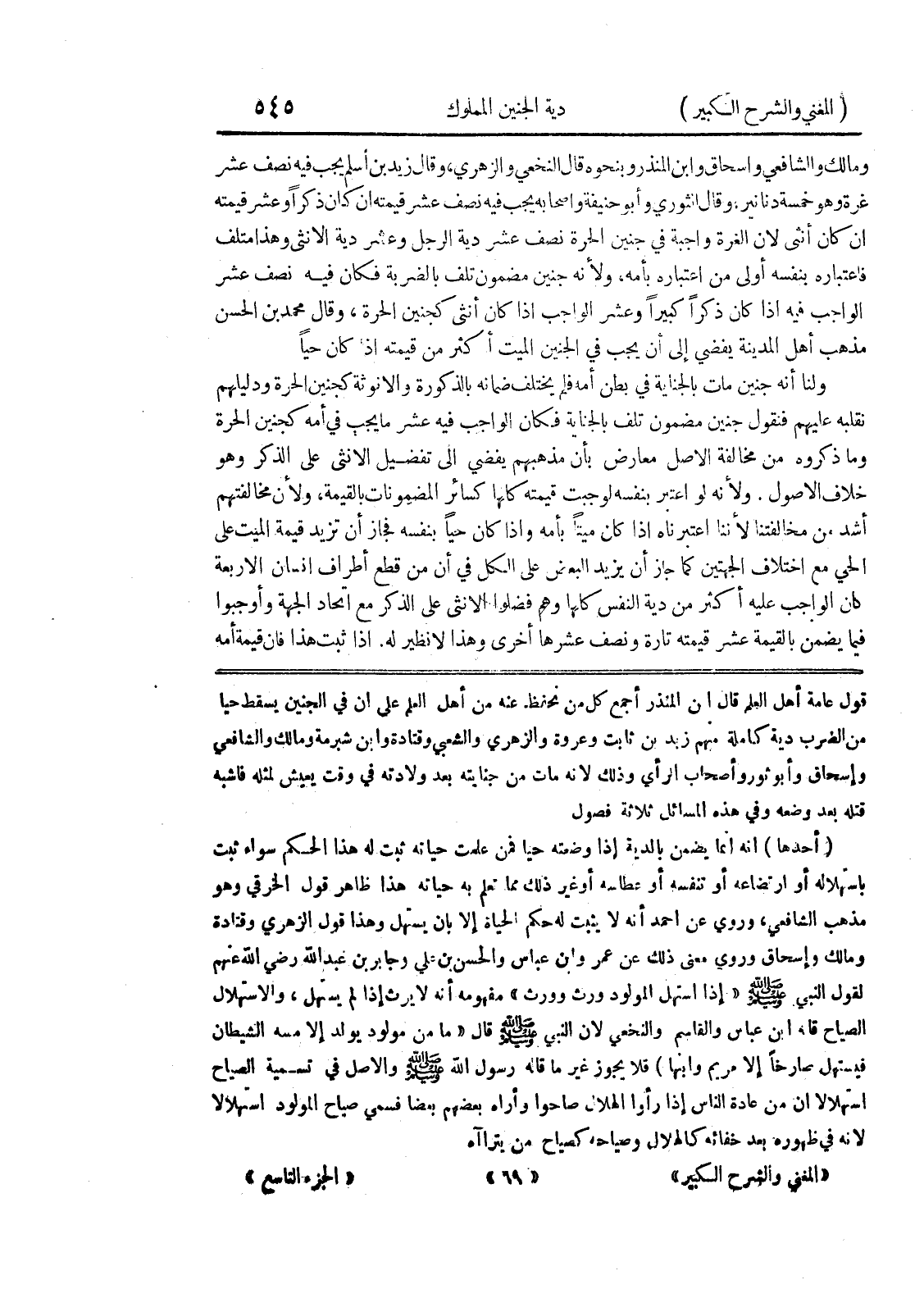 قول عامة أهل العلم قال إبن المنذر أجمع كل من نحفظ عنه من أهل العلم على أن في الجنين يسقط حياً من الضرب دية كاملة منهم زيد بن ثابت وعروة والزهري والشعبي وقتادة ابن شبرمة ومالك والشافعي واسحاق وأبو ثور وأصحاب الرأي وذلك لأنه مات من جنايته بعد ولادته في وقت يعيش لمثله فأشبه قتله بعد وضعه في هذه المسائل ثلاثة فصول (أحدهما) أنه انما يضمن بالدية إذا وضعته حياً فمن علمت حياته ثبت له هذا الحكم سواء ثبت باستهلاله أو ارتضاعه أو تنفسه او عطاسه أو غير ذلك مما تعلم به حياته هذا ظاهر قول الخرقي وهو مذهب الشافعي، وروى عن أحمد أنه لا يثبت له حكم الحياة إلا بأن يستهل وهذا قول الزهري وقتادة ومالك وإسحاق وروي معنى ذلك عن عمرو ابن عباس والحسن بن علي وجابر بن عبد الله رضي الله عنهم لقول النبي صلى الله عليه وسلم " إذا استهل المولود ورث وورث " مفهومه أنه لا يرث إذا لم يستهل، والاستهلال الصياح قاله ابن عباس والقاسم والنخعي لأن النبي صلى الله عليه وسلم قال " ما من مولود يولد لا مسه الشيطان فيستهل صارخاً إلا مريم وابنها) فلا يجوز غير ما قاله رسول الله صلى الله عليه وسلم والأصل في تسمية الصياح استهلال ان من عادة الناس إذا رأو الهلال صاحوا وأراه بعضهم بعضنا فسمي صياح المولود استهلالاً لأنه في ظهوره بعد خفائه كالهلال وصياحه كصياح من يتراآه