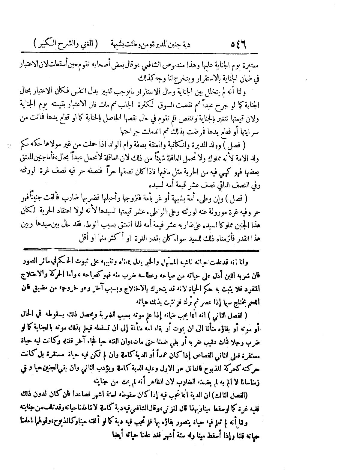 ولنا أنه قد علمت حياته فأشبه المستهل والخبر يدل بمعناه وتنبيهه على ثبوت الحكم في سائر الصور فإن شربه اللبن أدل على حياته من صياحه وعطاسه ضرب منه فهو كصياحه، وأما الحركة والاختلاج المنفرد فلا يثبت به حكم الحياة لأنه قد يتحرك بالاختلاج وبسبب آخر وهو خرجه من مضيق فإن اللحم يختلج سيما إذا عصر ثم ترك فلم نثبت بذلك حياته (الفصل الثاني) أنه إنما يجب ضمانه إذا علم موته بسبب الضربة ويحصل ذلك بسقوطه في الحال أو موته أو بقاؤه متألماً الى أن يموت أو بقاء أمه متألمة الى أن تسقطه فيعلم بذلك موته بالجناية كما لو