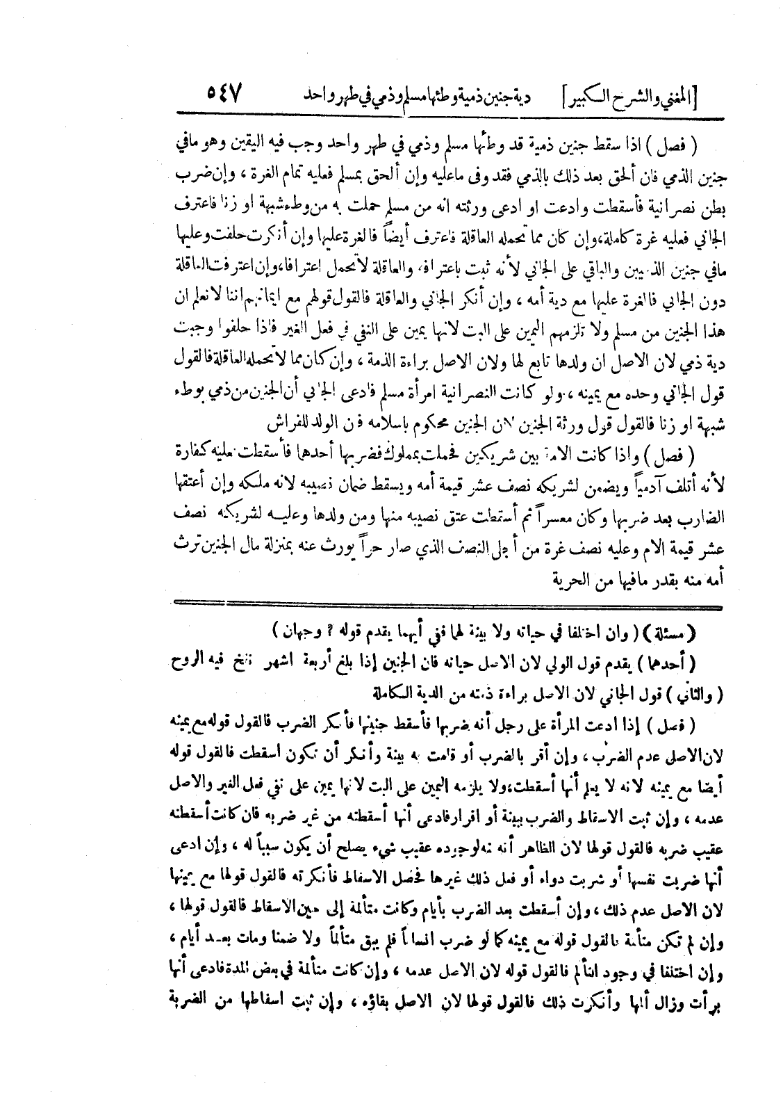 (مسألة) (وإن اختلفا في حياته ولا بينة لهما ففي أيهما يقدم قوله؟ وجهان) (أحدهما) يقدم قول الولي لأن الأصل حياته فإن الجنين إذا بلغ أربعة أشهر نفخ فيه الروح (والثاني) قول الجاني لأن الأصل براءة ذمته من الدية الكاملة (فصل) إذا دعت المرأة على رجل أنه ضربها فأسقط جنينها فأنكر الضرب فالقول قوله مع يمينه لأن الأصل عدم الضرب، وإن أقر بالضرب أو قامت به بينة وأنكر أن تكون أسقطت فالقول قوله أيضاً مع يمينه لأنه لا يعلم أنها أسقطت، ولا يلزمه اليمين على البت لأنها يمين على نفي فعل الغير والأصل عدمه، وإن ثبت الإسقاط والضرب ببينة أو إقرار فادعى أنها أسقطته من غير ضربه فإن كانت أسقطته عقيب ضربه فالقول قولها لأن الظاهر أنه منه لوجوده عقيب شئ يصلح أن يكون سبباً له، وإن ادعى أنها ضربت نفسها أو شربت دواء أو فعل ذلك غيرها فحصل الإسقاط فأنكرته فالقول قولها مع يمينها لأن الأصل عدم ذلك، وإن أسقطت بعد الضرب بأيام وكانت متألمة الى حين الإسقاط فالقول قولها، وإن لم تكن متألمة فالقول قوله مع يمينه كما لو ضرب إنساناً فلم يبق متألماً ولا ضمناً ومات بعد أيام، وإن اختلفا في وجود التألم فالقول قوله لأن الأصل عدمه، وإن كانت متألمة في بعض المدة فدعى أنها برأت وزال ألمها وأنكرت ذلك فالقول قولها لأن الأصل بقاؤه، وإن ثبت إسقاطها من الضربة