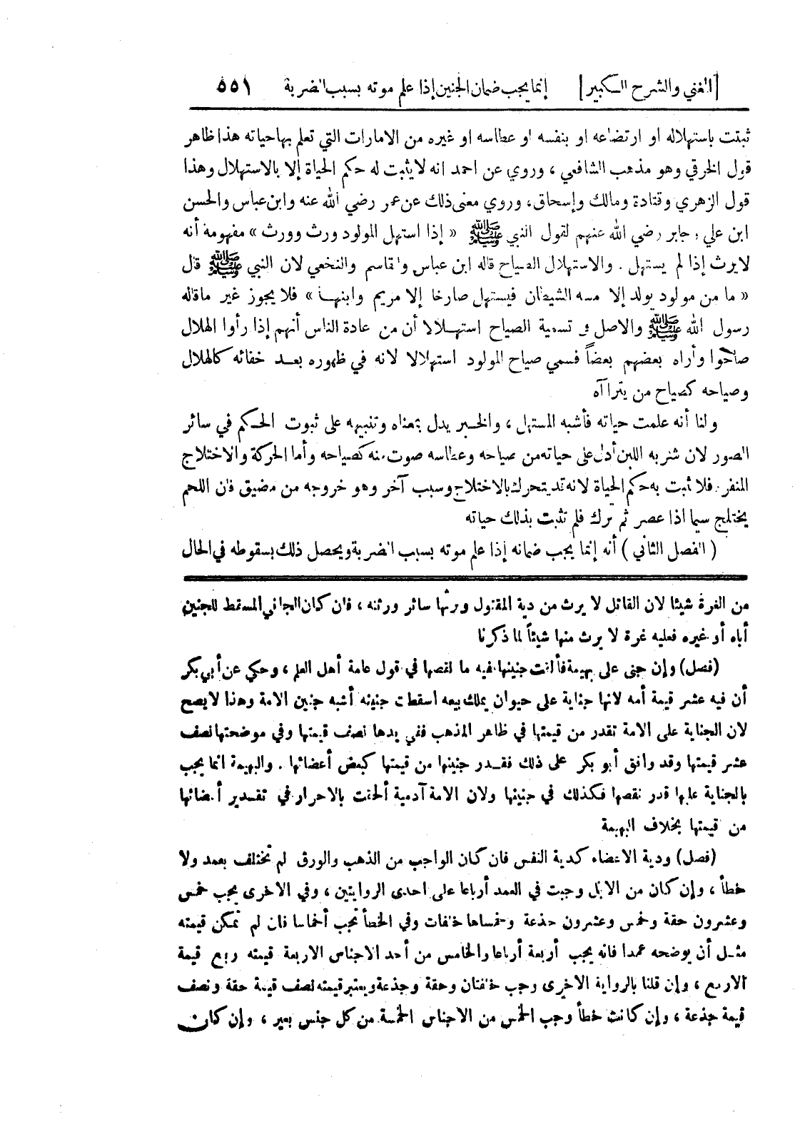 من الغرة شيئاً لأن القاتل لا يرث من دية المقتول ويرثها سائر ورثته، فإن كان الجاني المسقط للجنين أباه أو غيره فعليه غرة لا يرث منها شيئاً لما ذكرنا (فصل) وإن جني على بهيمة فألقت جنينها ففيه ما نقصها في قول عامة أهل العلم، وحكي عن أبي بكر ان فيه عشر قيمة أمه لانها جناية على حيوان يملك بيعه اسقطت جنينه أشبه جنين الأمة وهذا لا يصح لأن الجناية على الأمة تقدر من قيمتها في ظاهر المذهب ففي يدها نصف قيمتها وفي موضحتها نصف عشر قيمتها وقد وافق أبو بكر على ذلك فقدر جنينها من قيمتها كبعض أعضائها.