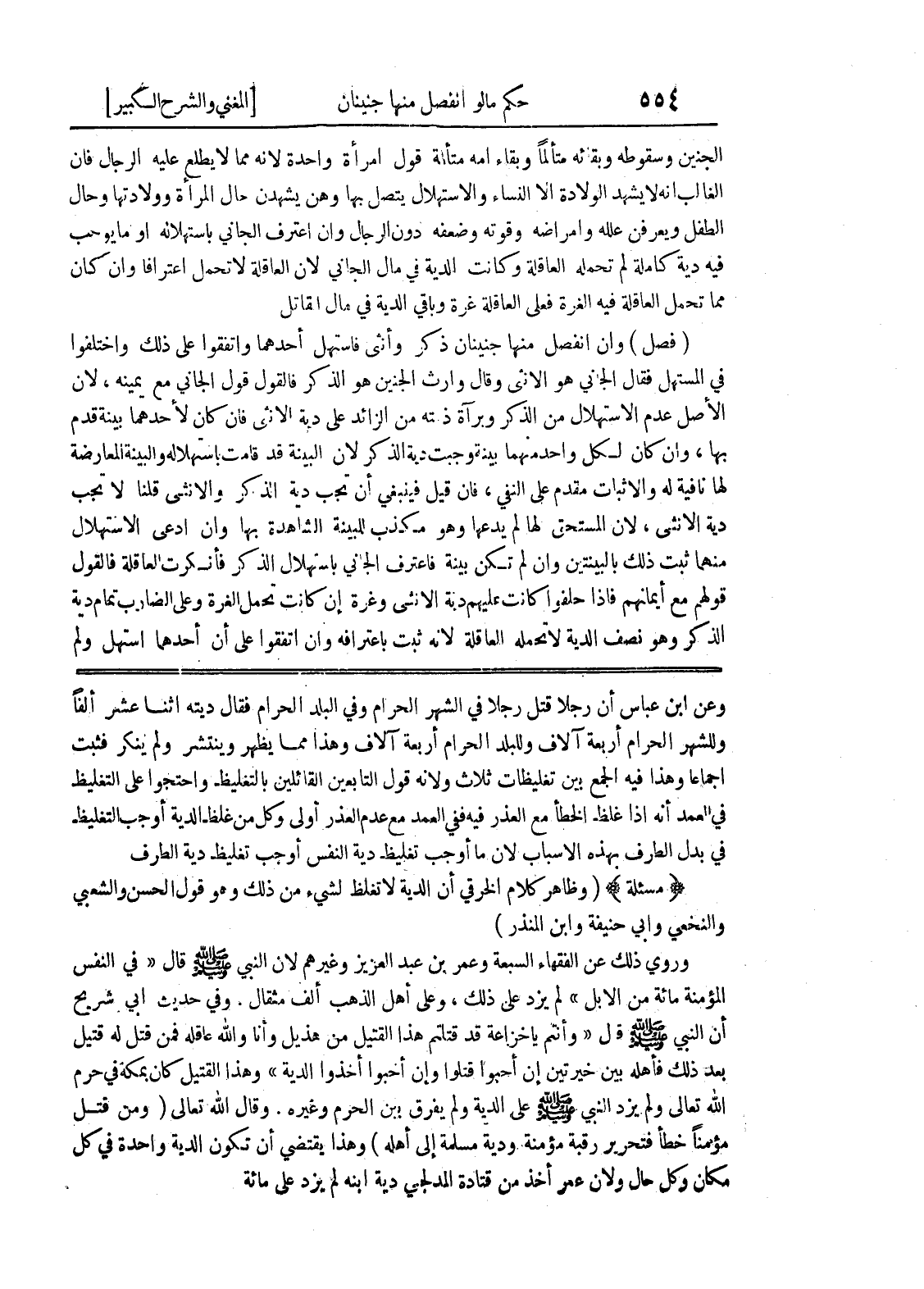 وعن ابن عباس أن رجلاً في الشهر الحرام وفي البلد الحرام فقال ديته اثنا عشر ألفاً وللشهر الحرام أربعة آلاف وللبلد الحرام أربعة آلاف وهذا مما يظهر وينتشر ولم ينكر فثبت إجماعاً وهذا فيه الجمع بين تغليظات ثلاث ولأنه قول التابعين والقائلين بالتغليظ واحتجوا على التغليظ في العمد أنه إذا غلظ الخطأ مع العذر فيه ففي العمد مع عدم العذر أولى وكل من غلظ الدية أوجب التغليظ في بدل الطرف بهذه الأسباب لأن ما أوجب تغليظ دية النفس أوجب تغليظ دية الطرف (مسألة) (وظاهر كلام الخرقي ان الدية لا تغلظ لشئ من ذلك وهو قول الحسن والشعبي والنخعي وأبي حنيفة وابن المنذر) وروي ذلك عن الفقهاء السبعة وعمر بن عبد العزيز وغيرهم لأن النبي صلى الله عليه وسلم قال " في النفس المؤمنة مائة من الإبل " لم يزد على ذلك، وعلى أهل الذهب ألف مثقال.