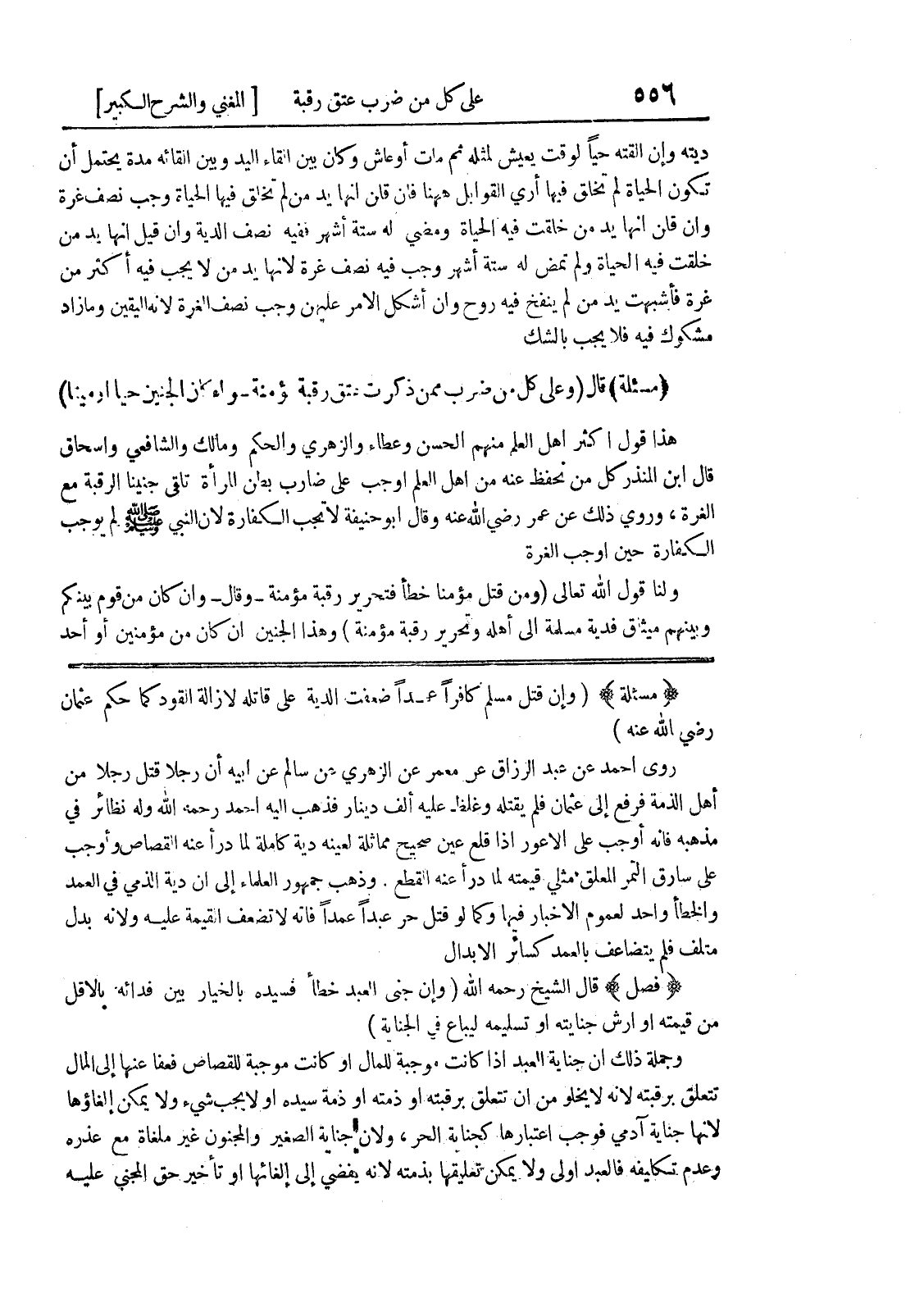 (مسألة) (وان قتل مسلم كافراً عمداً ضعفت الدية على قاتله لإزالة القود كما حكم عثمان رضي الله عنه) روى احمد عن عبد الرزاق عن معمر عن الزهري عن سالم عن أبيه أن رجلاً قتل رجلاً من أهل الذمة فرفع الى عثمان فلم يقتله وغلظ عليه الف دينار فذهب اليه أحمد رحمه الله وله نظائر في مذهبه فإنه أوجب على الأعور إذا قلع عين صحيح مماثلة لعينه دية كاملة لما درأ عنه القصاص وأوجب على سارق التمر المعلق مثلي قيمته لما درأ عنه القطع.