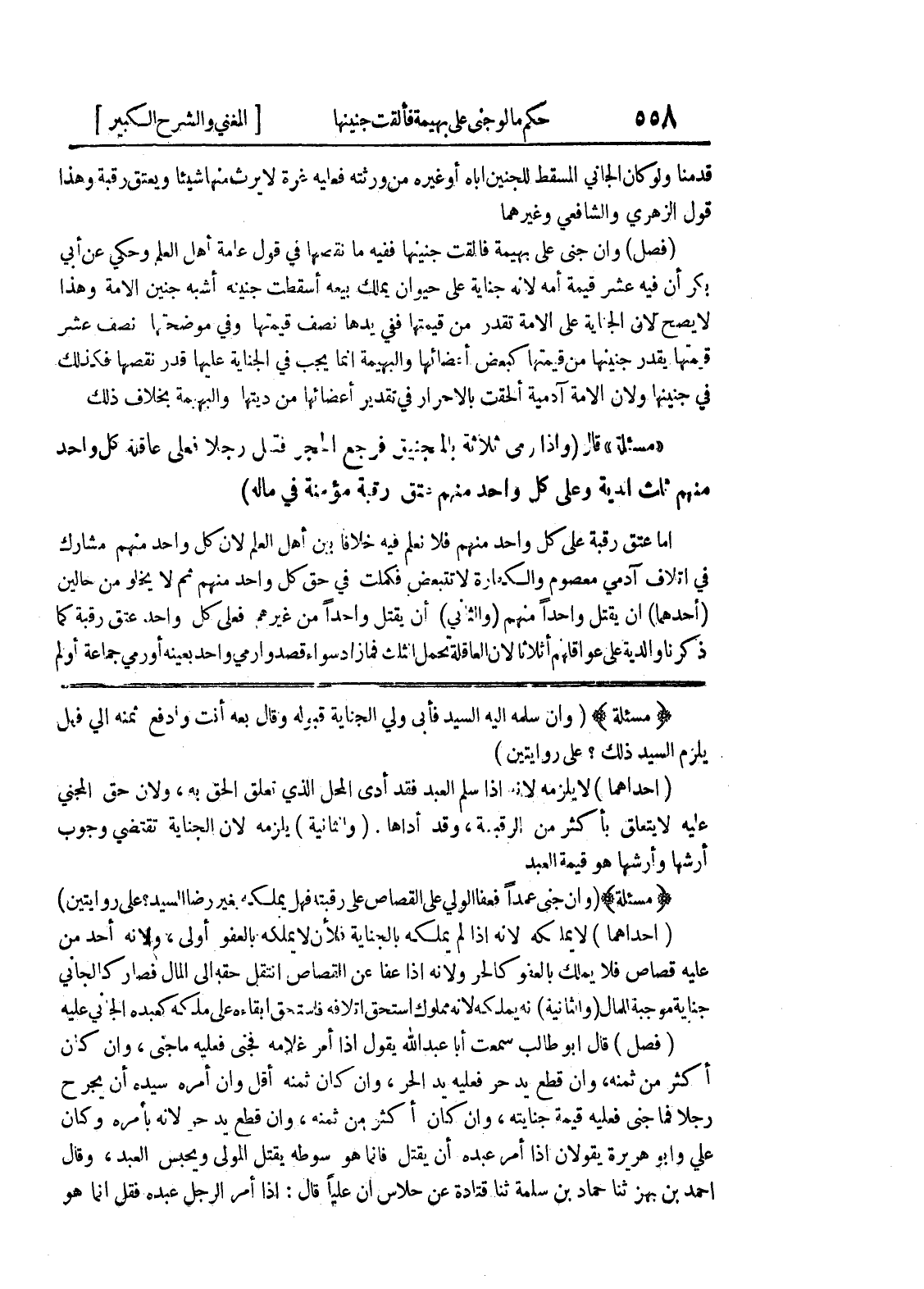 (إحداهما) لا يملكه لأنه إذا لم يملكه بالجناية فلأن لا يملكه بالعفو أولى، ولأنه أحد من عليه قصاص فلا يملك بالعفو كالحر ولأنه إذا عفا عن القصاص انتقل حقه الى المال فصار كالجاني جناية موجبة للمال (والثانية) أنه يملكه لأنه مملوك استحق اتلافه فاستحق ابقاء على ملكه كعبده الجاني عليه (فصل) قال أبو طالب سمعت أبا عبد الله يقول إذا أمر غلامه فجنى فعليه ما جنى، وإن كان أكثر من ثمنه، وإن قطع يد حر فعليه يد الحر، وإن كان ثمنه أقل وإن أمره سيده أن يجرح رجلاً فما جنى فعليه قيمة جناية، وإن كان أكثر من ثمنه، وإن قطع يد حر لأنه بأمره وكان علي وابو هريرة يقولان إذا امر عبده ان يقتل فإنما هو سوطه يقتل الولي ويحبس العبد، وقال احمد بن بهز ثنا حماد بن سلمة ثنا قتادة عن حلاس ان عليا قال: إذا أمر الرجل عبده فقل إنما هو