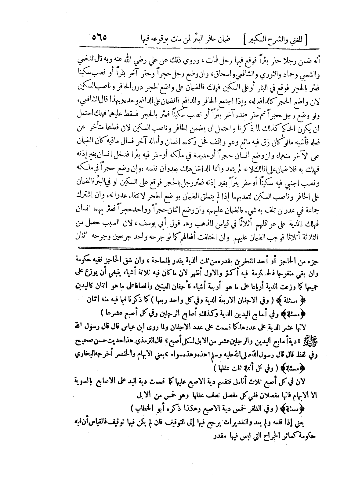 جزء من الحاجز أو أحد المنخرين بقدره من ثلث الدية يقدر بالمساحة، وان اشق الحاجز ففيه حكومة وان بقي منفرجاً فالحكومة فيه أكثر والأول أظهر لأن ما كان فيه ثلاثة أشياء ينبغي أن يوزع على جميعها كما وزعت الدية ارباعاً على ما هو أربعة أشياء كأجفان العينين وانصافاً على ما هو اثنان كاليدين (مسألة) (وفي الأجفان الأربعة الدية وفي كل واحد ربعها) كما ذكرنا فيما فيه منه اثنان (مسألة) وفي اصابع اليدين الدية وكذلك أصابع الرجلين وفي كل اصبع عشرها) لانها عشر الدية على عددها كما قسمت على عدد الأجفان ولما روى ابن عباس قال قال رسول الله صلى الله عليه وسلم " دية أصابع اليدين والرجلين عشر من الإبل لكل أصبع " قال الترمذي هذا حديث حسن صحيح وفي لفظ قال قال رسول الله صلى الله عليه وسلم " هذه وهذه سواء " يعني الإبهام والخنصر أخرجه البخاري (مسألة) (وفي كل أنملة ثلث عقلها) لأن في كل اصبع ثلاث أنامل فتقسم دية الأصبع عليها كما قسمت دية اليد على الأصابع بالسوية إلا الإبهام فإنها مفصلان ففي كل مفصل نصف عقلها وهو خمس من الإبل (مسألة) (وفي الظفر خمس دية الأصبع وهكذا ذكره أبو الخطاب) يعني إذا قلعه ولم يعد والتقديرات يرجع فيها الى التوقيف فإن لم يكن فيها توقيف فالقياس أن فيه حكومة كسائر الجراح التي ليس فيها مقدر