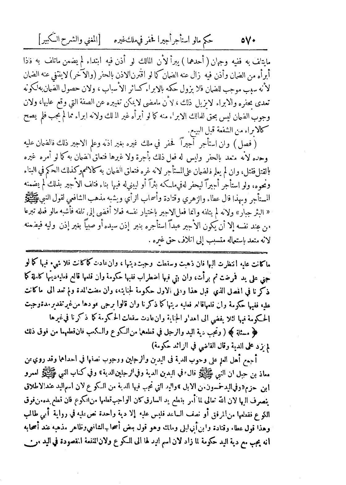 ابن حزم " وفي اليد خمسون من الإبل " واليد التي تجب فيها الدية من الكوع لأن اسم اليد عند الاطلاق ينصرف اليها لأن الله تعالى لما أمر بقطع يد السارق كان الواجب قطعها من الكوع فإن قطع يده من فوق الكوع فقطعها من المرفق أو نصف الساعد فليس عليه إلا دية واحدة نص عليه في رواية أبي طالب وهذا قول عطاء وقتادة وابن أبي ليلى ومالك وهو قول بعض اصحاب الشافعي وظاهر مذهبه عند اصحابه انه يجب مع دية اليد حكومة لما زاد لأن اسم اليد لها الى الكوع ولأن المنفعة المقصودة في اليد من